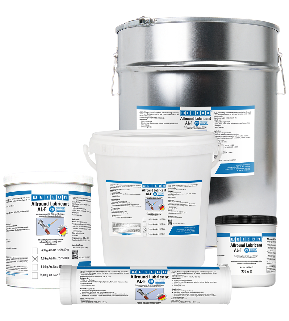 WEICON AL-F dapat digunakan untuk melumasi bantalan rol dan geser, sambungan, tuas, pemandu geser, spindel, poros spline, poros bubungan, roda gigi terbuka, roda gigi cacing, dan semua titik pelumasan gemuk. Karena telah mendapatkan persetujuan NSF H2, gemuk ini cocok untuk digunakan dalam industri makanan.