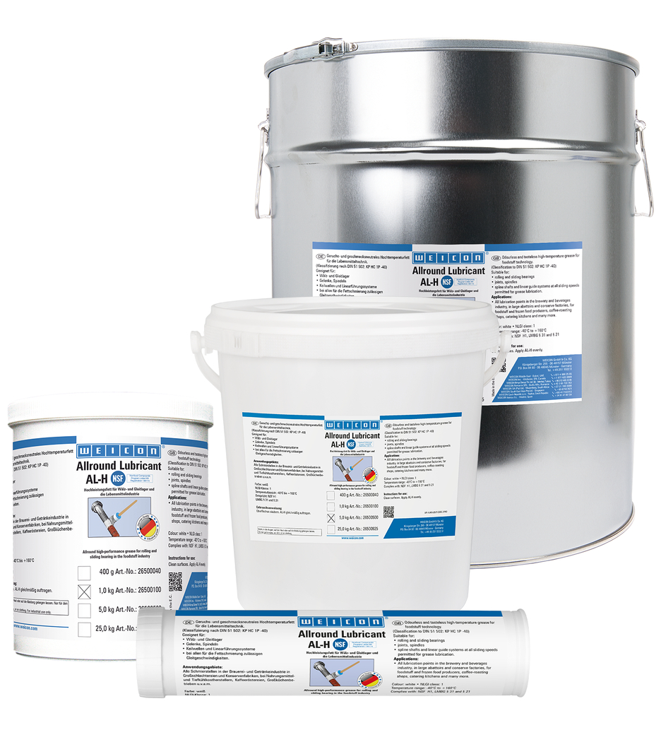 WEICON AL-H cocok untuk bantalan rol dan geser, sambungan, spindel, poros bergaris, dan sistem pemandu linier pada semua kecepatan geser yang diizinkan untuk pelumasan gemuk. Berkat formulasi khusus dan persetujuan NSF H1, AL-H sangat cocok untuk digunakan dalam teknologi pemrosesan makanan.