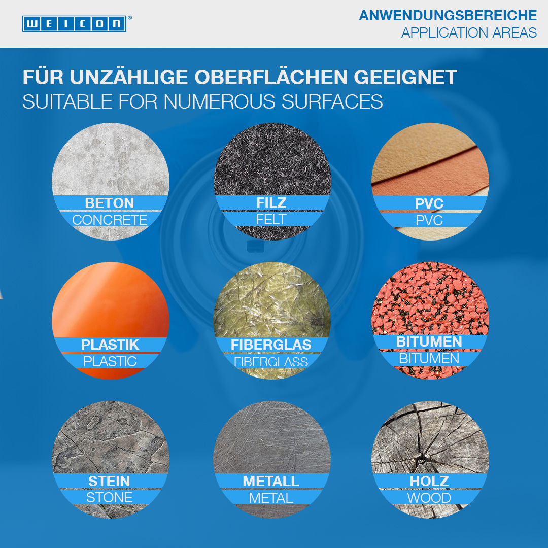 WEICON Allround Sealing Spray adalah plastik yang sangat rekat dan dapat disemprotkan untuk menutup kebocoran. Produk ini dikembangkan secara khusus untuk menyegel retakan dan lapisan tipis di dalam dan di luar ruangan. Dapat digunakan untuk menyegel berbagai komponen, seperti talang air, pipa pembuangan dan drainase, karavan, rumah mobil, perahu, atap, jendela, dinding kolam, foil kolam, poros ruang bawah tanah, dan poros ventilasi. Allround Sealing Spray melekat pada banyak permukaan, seperti batu, logam, plastik, kayu, enamel, dan banyak lagi. Semprotan ini dapat dicat, tahan air, dan tahan terhadap cuaca dan sinar UV. Melindungi logam dari korosi dan bebas dari aspal dan silikon.