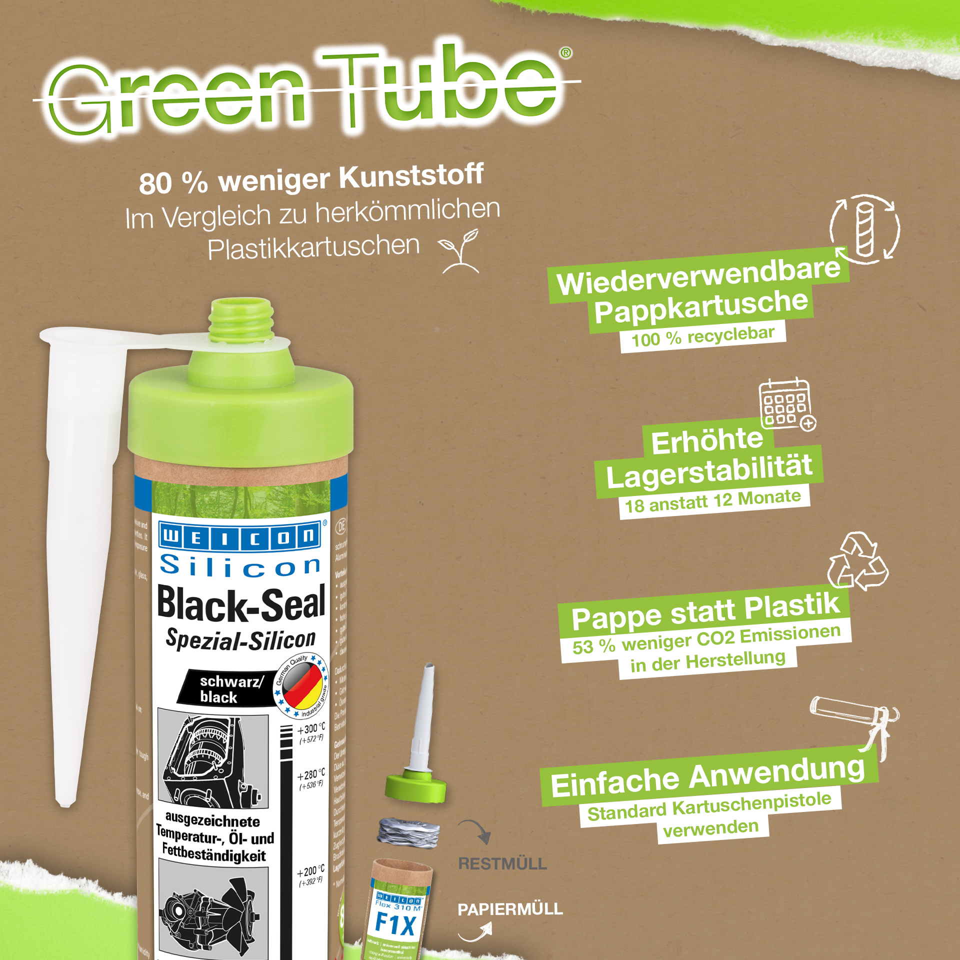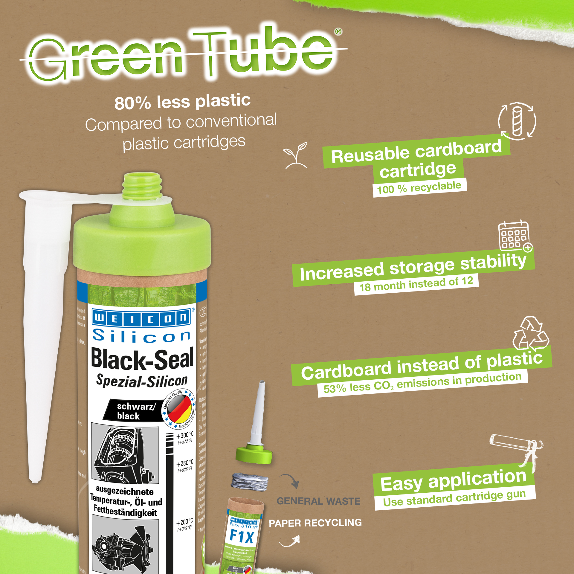 WEICON Black-Seal berwarna hitam, tahan suhu tinggi (+280 ° C/+536 ° F), bebas pelarut, kuat, tahan minyak, tahan minyak, tahan tekanan, tahan terhadap penuaan dan sangat elastis (perpanjangan putus sekitar 500%). Sangat cocok untuk pengikatan dan penyegelan pada aplikasi yang membutuhkan ketahanan minyak dan lemak yang tinggi. Produk ini dapat digunakan pada gearbox, penutup katup dan casing, bak oli, pompa air, roda gigi dan as roda, flensa, tangki dan wadah, dan di banyak area lainnya.