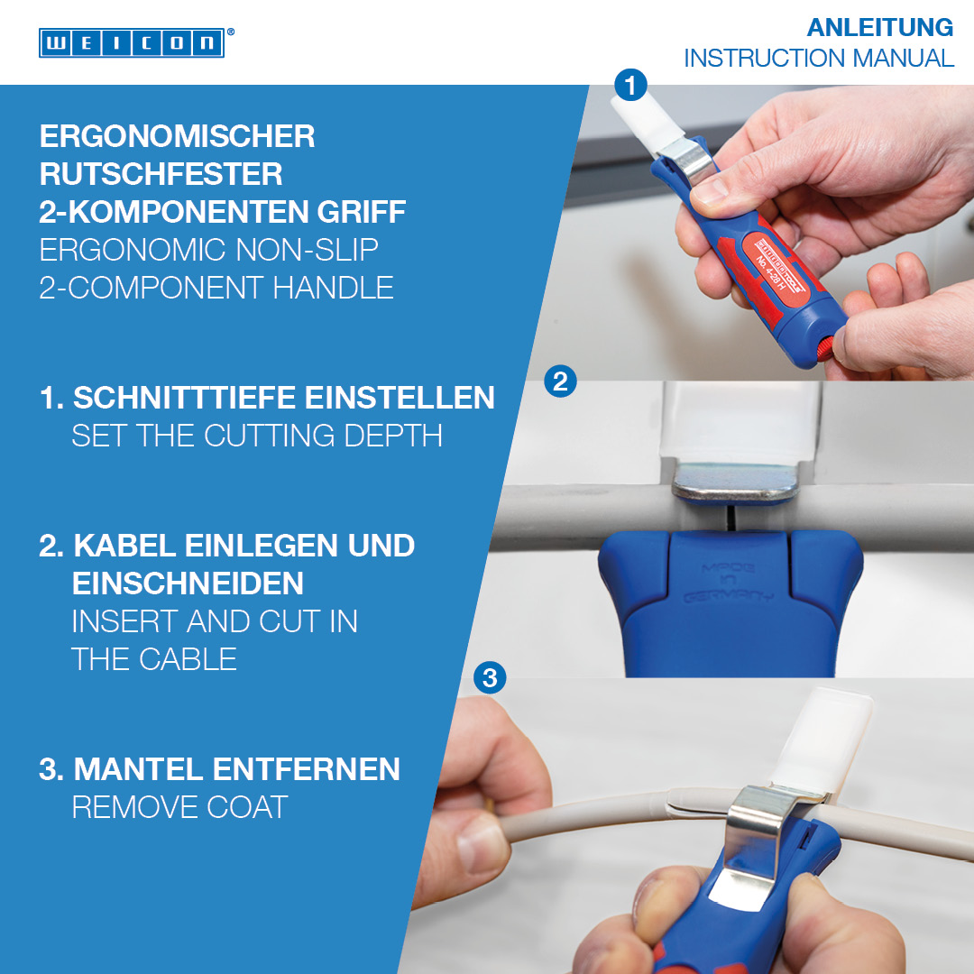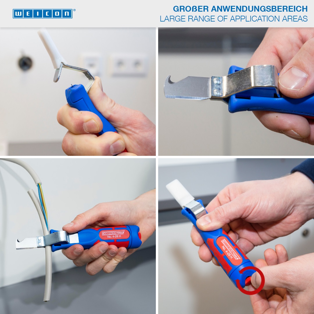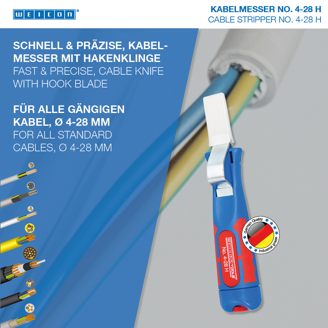 Cable Stripper 4-28 H memungkinkan pengupasan yang tepat, cepat, dan aman untuk semua kabel bundar yang umum dengan diameter antara 4 dan 28 milimeter. Cable Stripper memiliki pegangan multi-komponen yang tidak licin dengan bentuk yang ergonomis. Berkat sekrup pengatur di bagian belakang pegangan, kedalaman pemotongan dapat disesuaikan dengan rentang variabel yang tak terbatas. Hal ini mencegah kerusakan pada konduktor bagian dalam. Mata pisau pemotong terintegrasi di dalam housing dan dapat berputar sendiri, sehingga memungkinkan penyesuaian otomatis dari pemotongan melingkar ke pemotongan memanjang. Selain itu, 4-28 H memiliki mata pisau pengait yang dapat ditutup dengan tutup pengaman. Tutup ini mengunci mata pisau dengan aman, yang secara signifikan mengurangi risiko cedera.