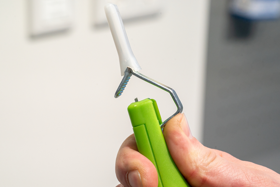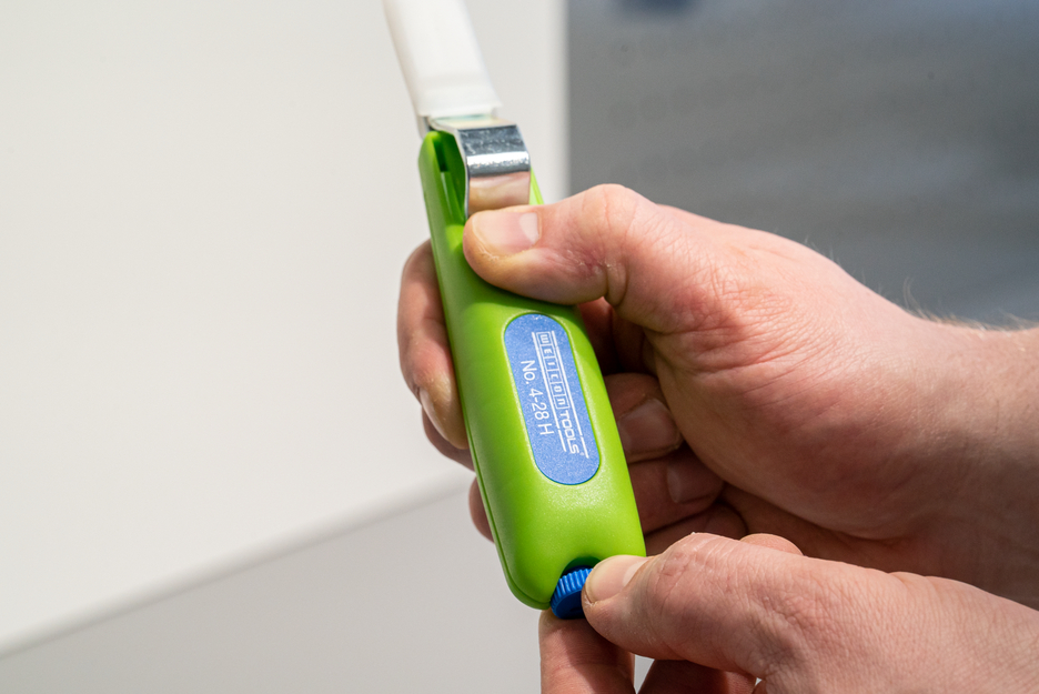 Pada type pengupas kabel dengan garis hijau, rangkaian alat yang sangat istimewa telah dikembangkan. Alat-alat ini terbuat dari hingga 97% bahan baku yang dapat didaur ulang dan memiliki penilaian siklus hidup yang sangat baik. Pengupas kabel 4-28 H memungkinkan pengupasan yang tepat, cepat, dan aman untuk semua kabel bundar yang umum dengan diameter antara 4 dan 28 milimeter. Berkat sekrup pengatur di bagian belakang gagang, kedalaman pemotongan dapat disesuaikan dengan rentang variabel yang tak terbatas. Hal ini mencegah kerusakan pada konduktor bagian dalam. Mata pisau pemotong terintegrasi dalam housing dan dapat berputar sendiri, sehingga memungkinkan penyesuaian otomatis dari pemotongan melingkar ke pemotongan memanjang. Selain itu, 4-28 H memiliki mata pisau pengait yang dapat ditutup dengan tutup pengaman. Tutup ini mengunci mata pisau dengan aman, yang secara signifikan mengurangi risiko cedera.