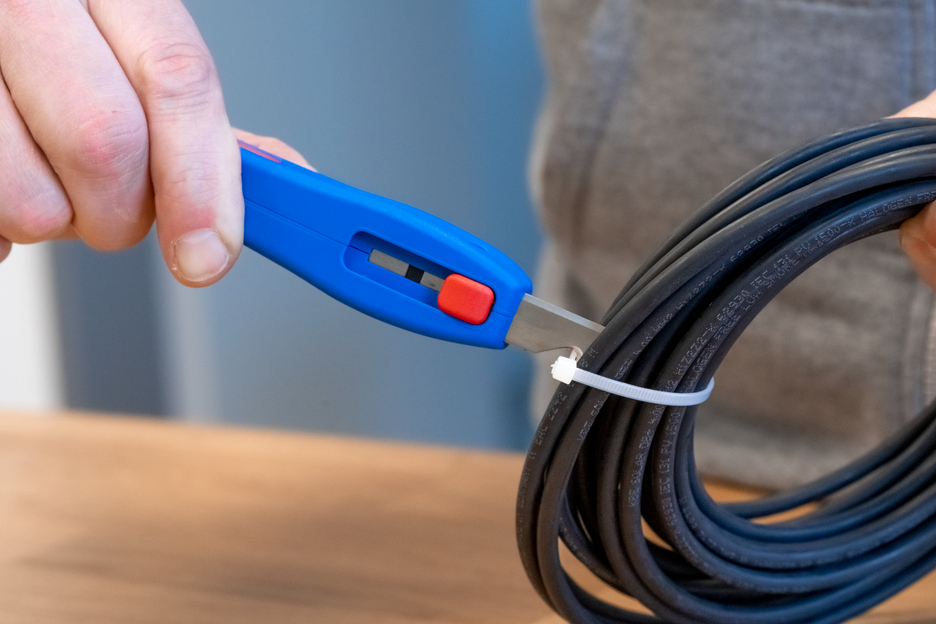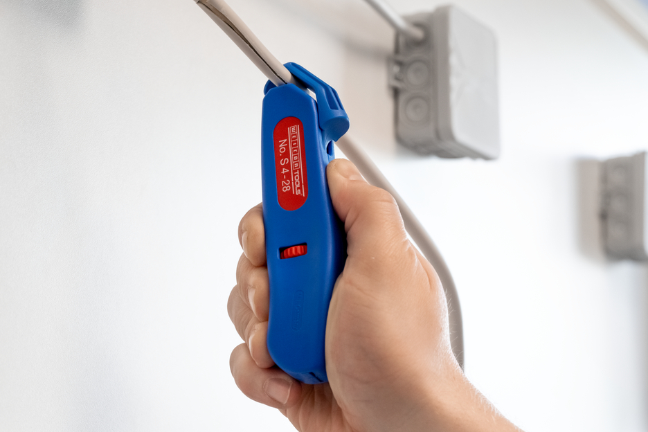 Cable Stripper No. S 4 - 28 memungkinkan pengupasan yang tepat, cepat dan aman untuk semua kabel bundar yang umum dengan diameter antara 4 dan 28 milimeter. Berkat sekrup penyetelan pada housing, kedalaman pemotongan pisau dapat diatur dengan rentang variabel yang tak terbatas. Hal ini mencegah kerusakan pada konduktor bagian dalam. Mata pisau pemotong terintegrasi dalam wadah dan dapat berputar sendiri, sehingga memungkinkan penyesuaian otomatis dari pemotongan melingkar ke pemotongan memanjang. Selain itu, mata pisau pengait telah diintegrasikan ke dalam S 4-28, yang dapat ditarik ke dalam rangka. Mata pisau dapat dikunci pada kedua posisi. Hal ini menyebabkan pengurangan yang signifikan dalam risiko cedera yang dibawa oleh mata pisau yang menetap.
