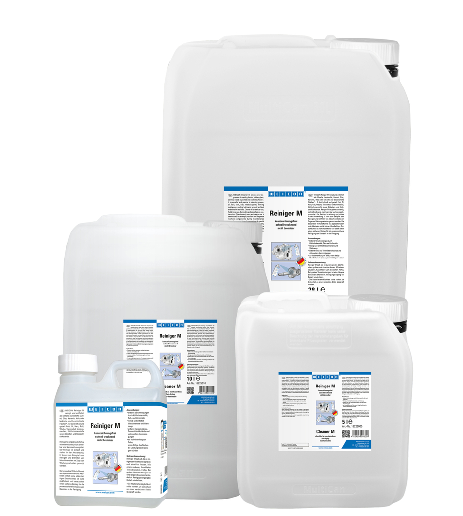 WEICON Cleaner M membersihkan dan menghilangkan semua logam, plastik, karet, kaca, keramik, kayu, atau permukaan yang dicat dan dilapisi. Produk ini ampuh dan tepat dalam membersihkan lemak, minyak, resin, jelaga, lilin, zat pelepas, zat pembentuk, pelumas pendingin, serta residu label dan perekat. Cleaner M siap digunakan, cepat kering, tidak mudah terbakar dan diklasifikasikan sebagai tidak berbahaya. Pembersih ini mudah dan aman digunakan. Pembersih ini dapat digunakan, misalnya, untuk membersihkan dan menurunkan kadar minyak pada komponen dan peralatan mesin. Formula khusus yang terdiri dari surfaktan dan alkohol khusus tidak mengandung penghilang busa silikon, tidak berminyak, sehingga berkontribusi secara signifikan terhadap pembersihan komponen yang aman bagi proses produksi.