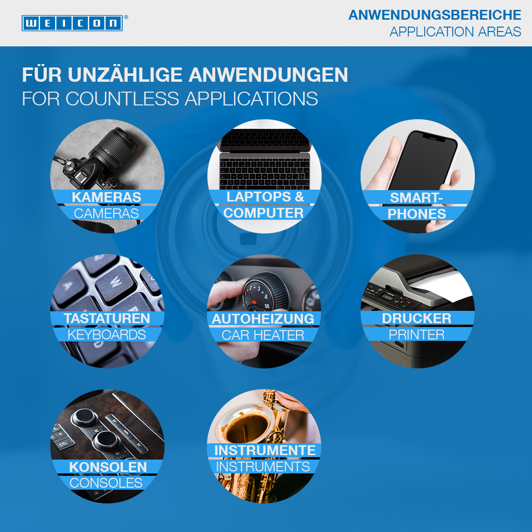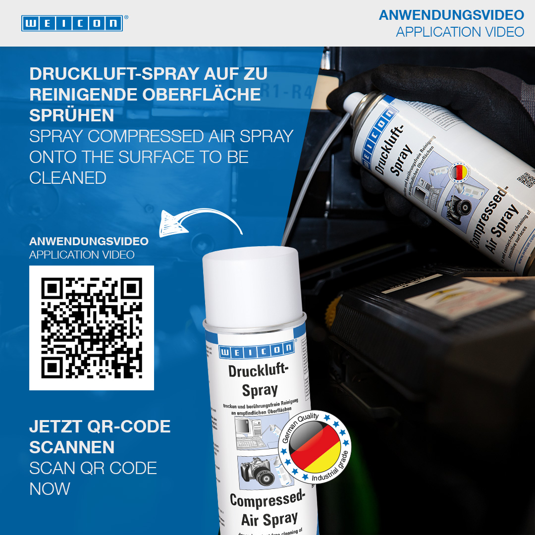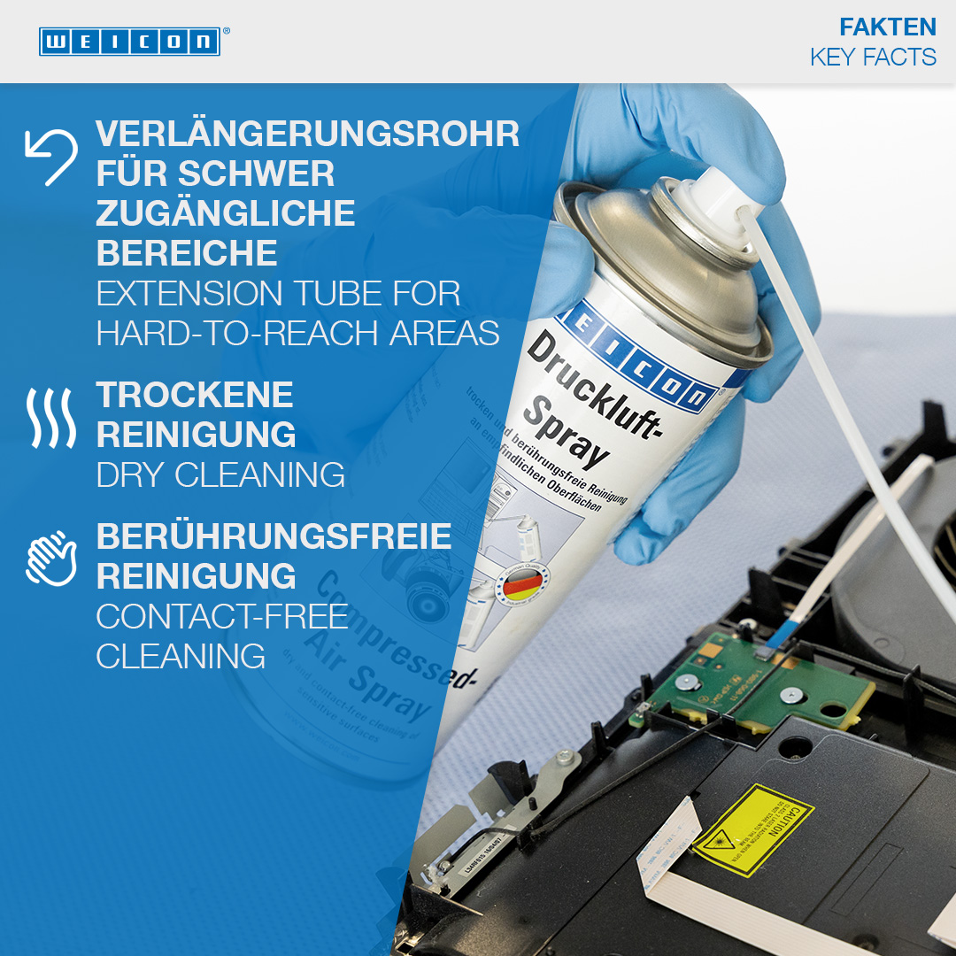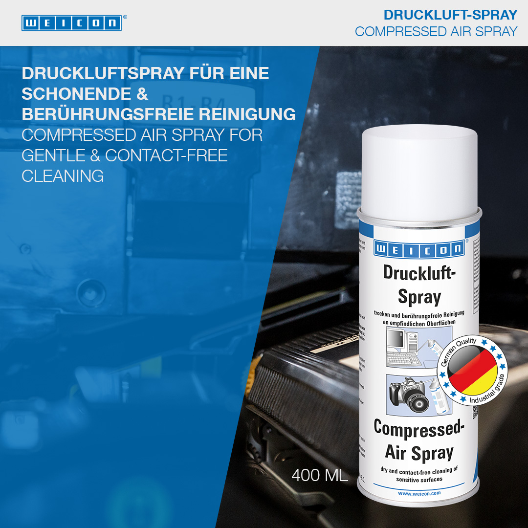 WEICON Compressed-Air Spray dapat digunakan di mana pun debu tidak dapat dengan mudah dihilangkan dengan metode konvensional dan pada bagian yang sulit dijangkau. Hal ini memungkinkan pembersihan kering dan bebas kontak pada sudut-sudut yang tidak dapat diakses dan permukaan yang sensitif. WEICON Compressed-Air Spray dapat digunakan pada perangkat HiFi dan video (misalnya modul, papan sirkuit, kepala magnetik, hard drive, dll.), dalam optik (misalnya pada kamera, objektif, lensa), pada kotak sekering mobil dan unit penghapus, pada jarum jam (jam kuarsa), dalam teknologi medis, pembuatan model, teknologi pengukuran, pada komponen elektronik, dan papan sirkuit.