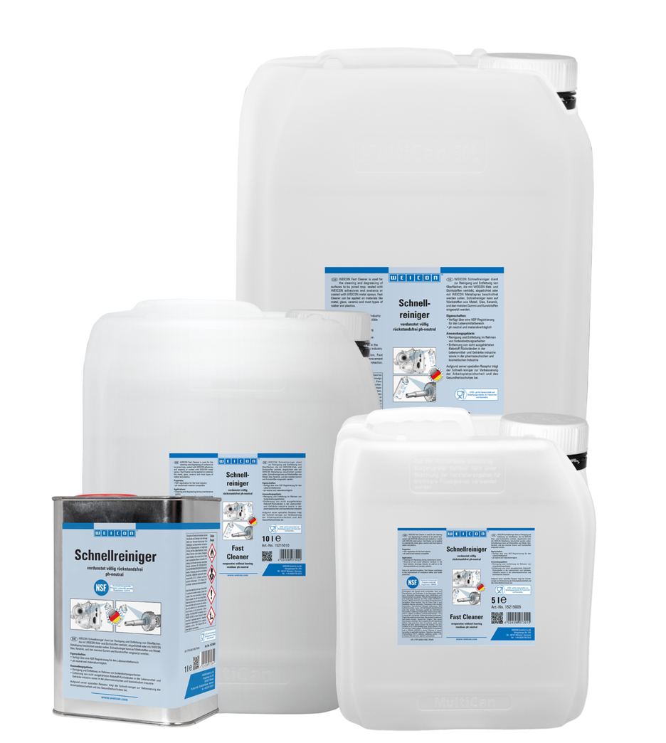 Fast Cleaner memiliki registrasi NSF untuk sektor makanan dan oleh karena itu dapat digunakan sebagai agen pembersih dan penghilang lemak untuk menghilangkan kontaminasi yang dihasilkan selama pekerjaan perawatan dan untuk menghilangkan residu perekat di industri makanan dan minuman serta industri farmasi dan kimia. Fast Cleaner digunakan untuk membersihkan dan menghilangkan lemak pada permukaan yang diikat atau disegel dengan perekat dan sealant WEICON, atau yang akan dilapisi dengan WEICON Metal Spray. Fast Cleaner memiliki pH netral dan kompatibel dengan berbagai bahan dan dapat digunakan pada berbagai bahan seperti logam, kaca, keramik, serta sebagian besar karet dan plastik. Karena formula khusus dan registrasi NSF yang dihasilkan, Fast Cleaner dapat berkontribusi terhadap peningkatan perlindungan keselamatan dan kesehatan kerja.