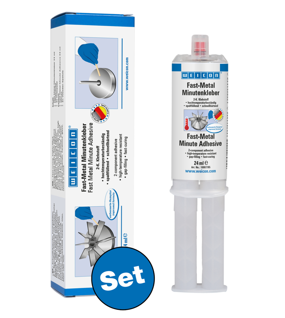 WEICON Fast-Metal Minute Adhesive is a 2-component epoxy resin system specifically developed for repairs and bonding applications where larger tolerances need to be bridged. Thanks to its gap-filling properties, the adhesive is suitable for rough and poorly fitting surfaces and fills cracks, cavities and uneven areas. Fast-Metal Minute Adhesive is resistant to temperatures up to +180 °C and offers extremely strong adhesion even on vertical surfaces. The system is highly-filled, pasty, has a very short pot life and cures quickly. It allows for impact-resistant bonds with high tensile and impact strength. WEICON Fast-Metal Minute Adhesive can be used on numerous materials such as metal, plastic, fibre-reinforced materials, ceramics, glass, stone and wood. The adhesive can be used in many areas of industry, in crafts and for demanding DIY projects.