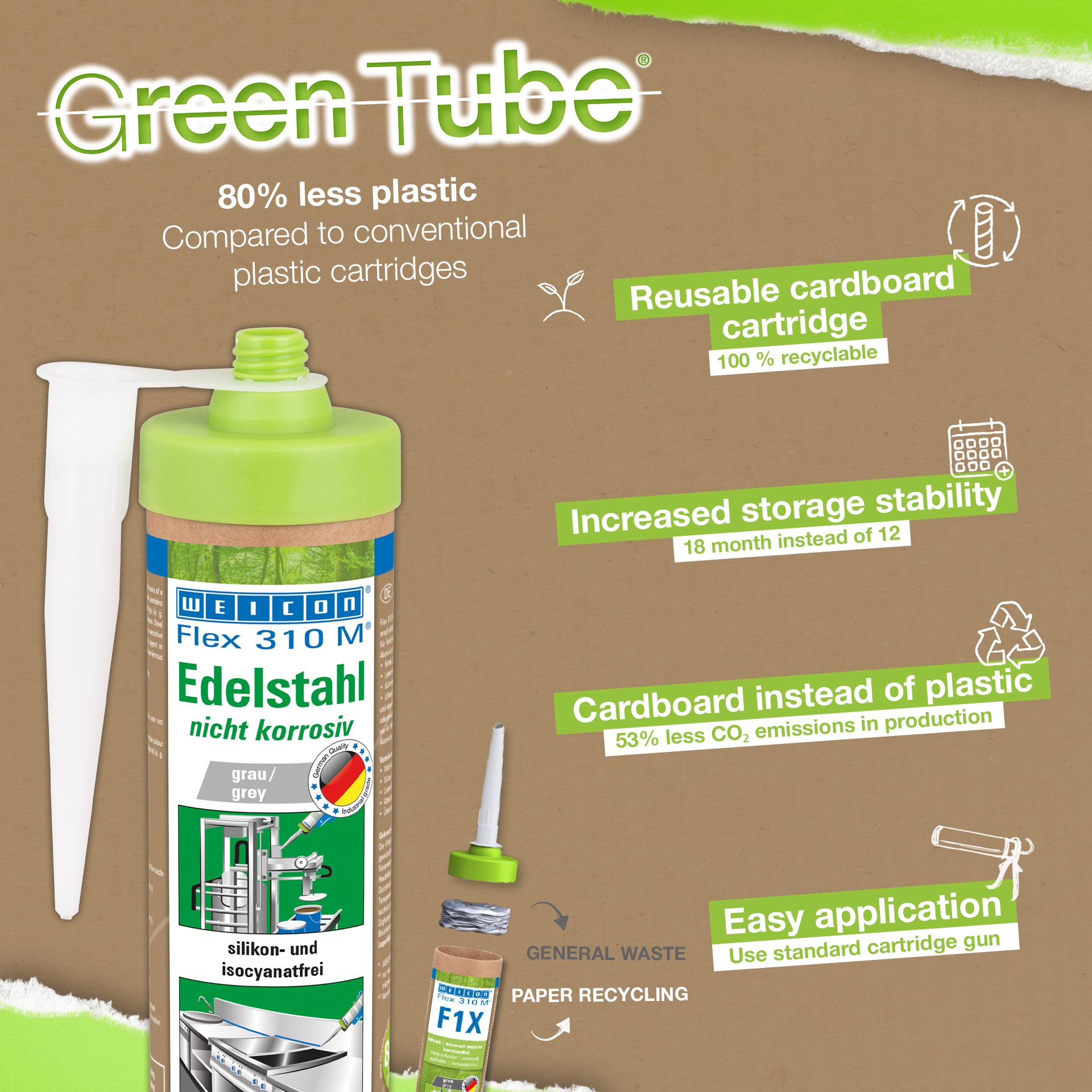 WEICON Flex 310 M Perekat dan Sealant Baja Tahan Karat tidak korosif, kuat, dapat dicat (basah dalam keadaan basah), dapat diampelas, tahan terhadap penuaan dan radiasi sinar UV serta bebas dari silikon, isosianat, halogen, atau pelarut. Produk ini memiliki sertifikat ISEGA dan dapat digunakan sebagai perekat dalam teknologi makanan. Flex 310 M Stainless Steel adalah perekat elastis yang berbahan dasar polimer MS dan cocok untuk pengikatan serta penyegelan jahitan dan sambungan pada logam, seperti baja tahan karat, aluminium, dan logam non-besi. Produk ini juga dapat digunakan di semua area aplikasi di mana warna perekat dan sealant harus sesuai dengan bahan permukaan (misalnya baja tahan karat, aluminium, dll.). WEICON Flex 310 M Stainless-Steel dapat digunakan dalam konstruksi logam, teknik tangki dan peralatan, di industri makanan, di dapur dan instalasi sanitasi, sistem ventilasi dan pendingin udara, dan di semua aplikasi di mana silikon atau produk yang mengandung silikon tidak cocok.