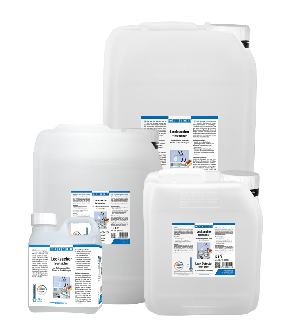 Leak Detection frost-proof sangat cocok untuk menemukan lokasi retakan atau bagian yang berpori pada pipa bertekanan dengan cepat, nyaman, dan andal. Leak Detection frost-proof tidak membentuk senyawa berbahaya dengan gas-gas ini: karbon dioksida (CO2), propana, butana, asetilena, oksigen, batu bara dan gas alam, nitrogen, dinitrogen monoksida (N2O), dan CFC. Tidak mudah terbakar. Deteksi Kebocoran anti beku cocok digunakan di mana pun udara bertekanan atau zat gas digunakan, misalnya pada pipa, selang, alat kelengkapan penyisipan, sambungan sekrup dan las, katup, dan adaptor.