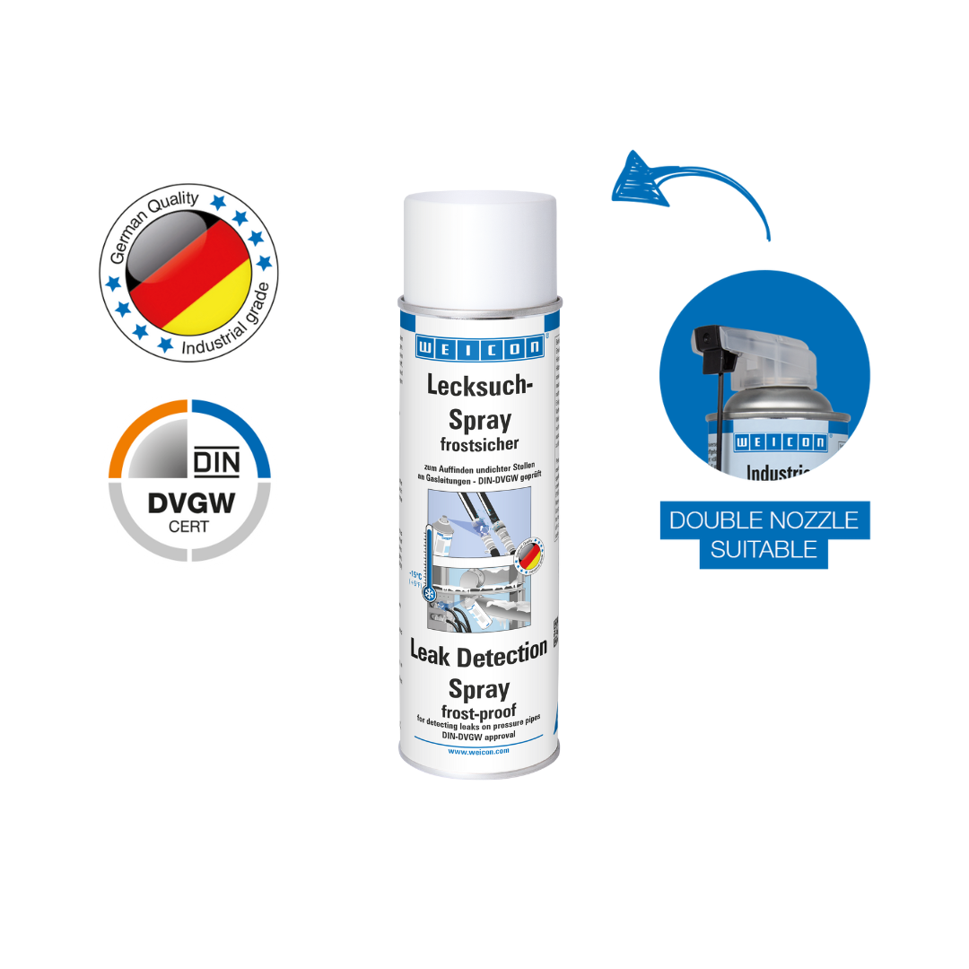 Cara yang aman, mudah dan cepat untuk menemukan kebocoran atau titik keropos pada pipa gas, sistem pendingin dan pendingin udara. Semprotan Pendeteksi Kebocoran anti beku tidak membentuk senyawa berbahaya dengan gas-gas berikut: karbon dioksida (CO2), propana, butana, etilena, oksigen, batu bara dan gas alam, nitrogen, dinitrogen monoksida (N2O), dan CFC. Tidak mudah terbakar. Leak Detection Spray anti beku cocok digunakan di mana pun udara bertekanan atau zat gas digunakan. Semprotan ini dapat digunakan, misalnya, pada pipa, selang, alat kelengkapan, sambungan yang disolder, sekrup dan las, alat kelengkapan, konektor katup dan adaptor.