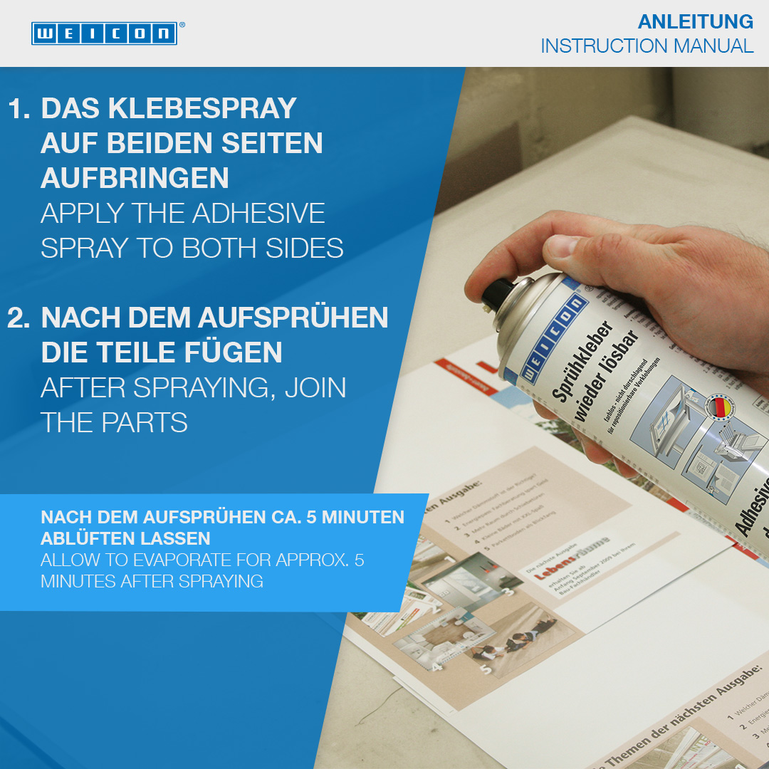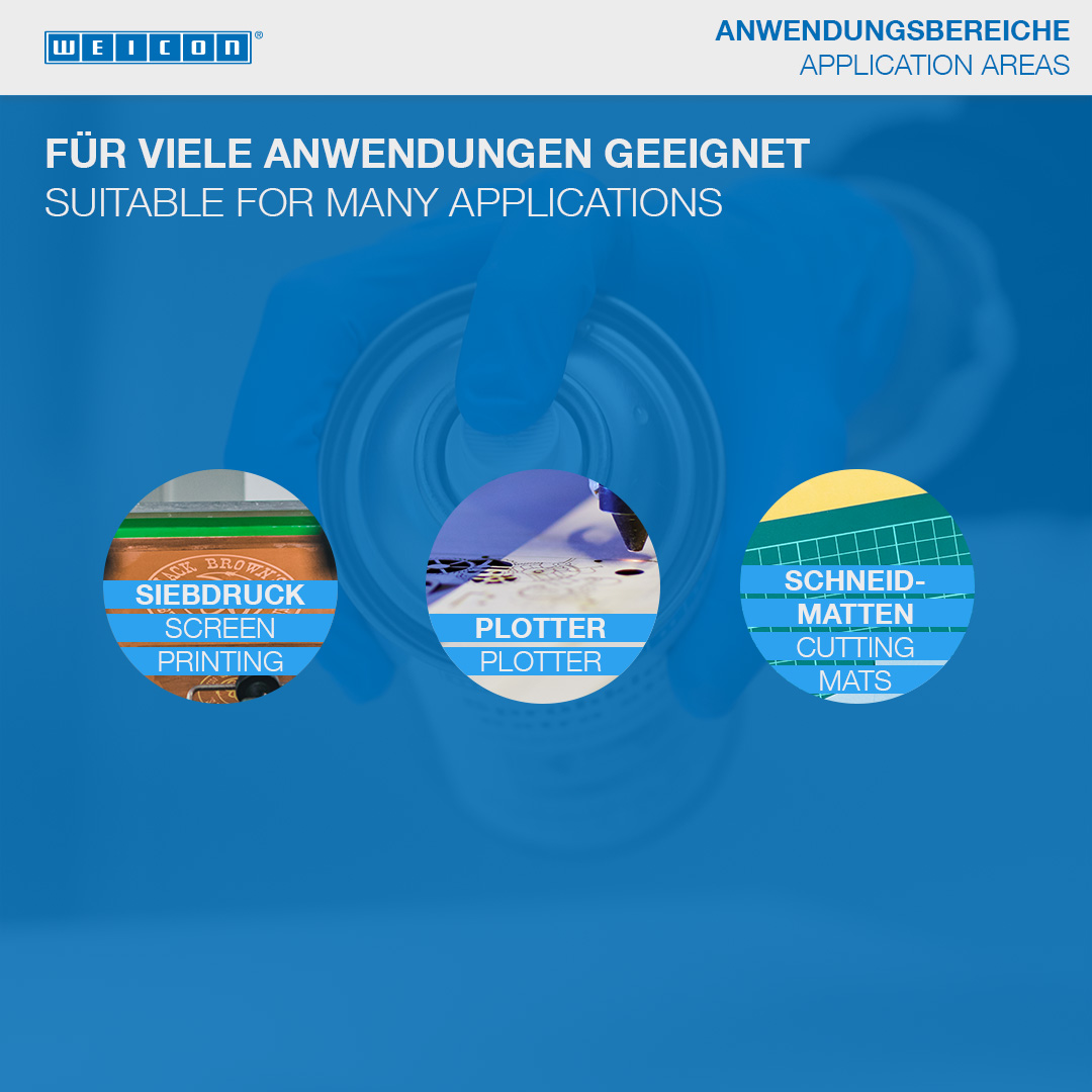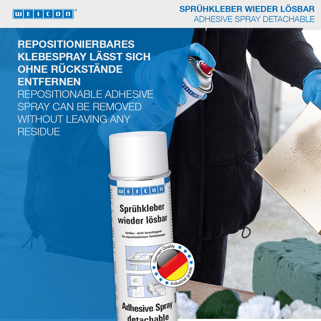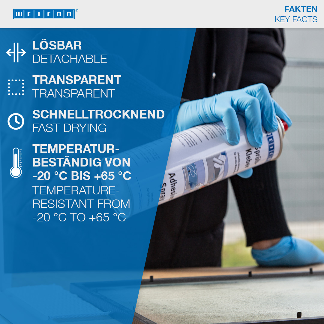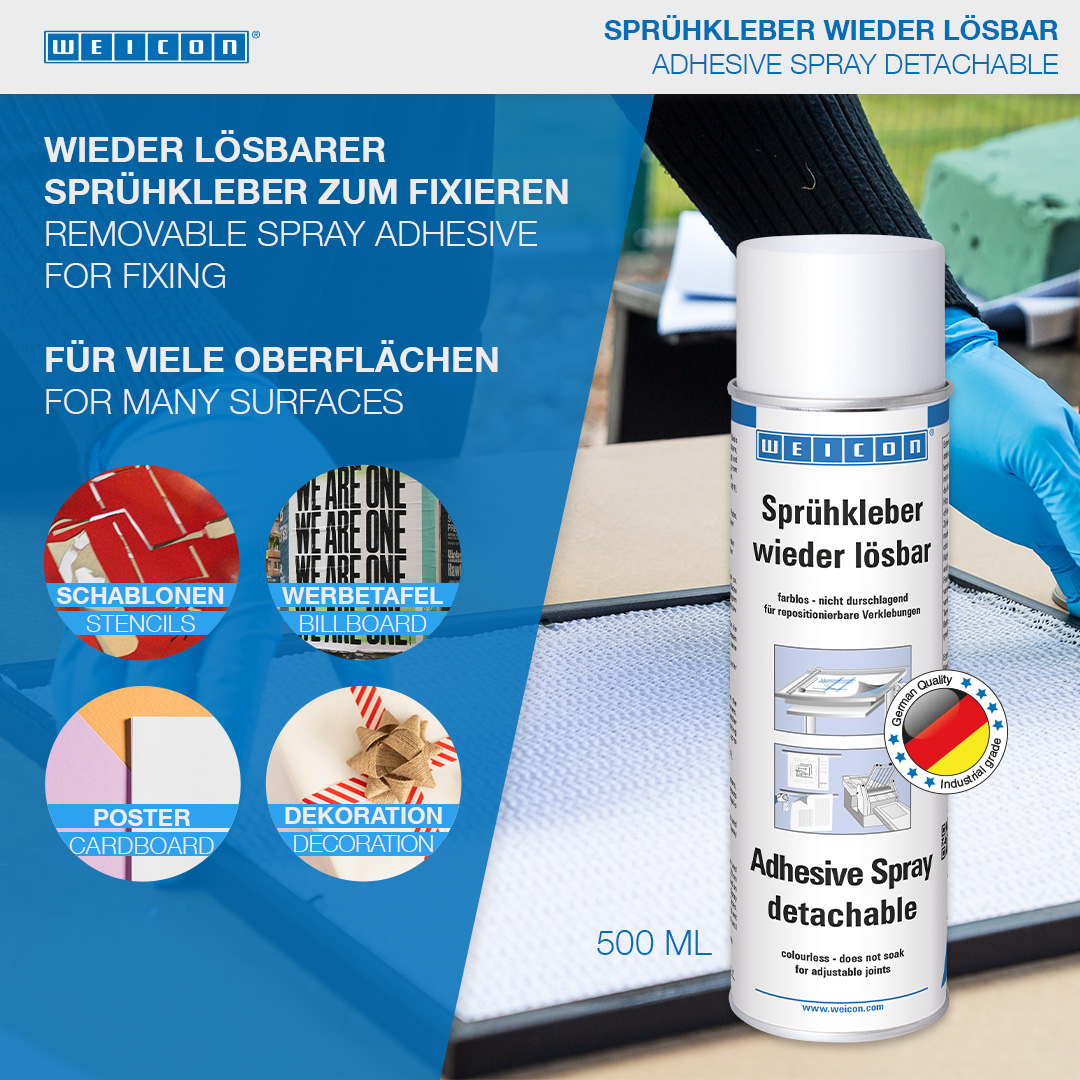 WEICON Adhesive Spray untuk sambungan yang dapat dilepas sangat cocok untuk sambungan yang dapat dilepas dan disesuaikan. WEICON Adhesive Spray untuk sambungan yang dapat dilepas tidak berwarna, tidak meresap atau menyebabkan perubahan warna, dan tidak meninggalkan permukaan yang bergelombang, bahkan ketika digunakan pada bahan yang tipis. Semprotan Perekat untuk sambungan yang dapat dilepas dapat digunakan untuk merekatkan kertas, karton, dan foil. Sambungan dapat dilepas ketika semprotan dioleskan ke satu sisi; mengoleskan semprotan ke kedua sisi membuat sambungan menjadi permanen. WEICON Adhesive Spray untuk sambungan yang dapat dilepas dapat digunakan, misalnya, untuk menyatukan templat, papan reklame, poster, foto, dekorasi dalam konstruksi pameran dagang, tata letak, dan gambar teknis.