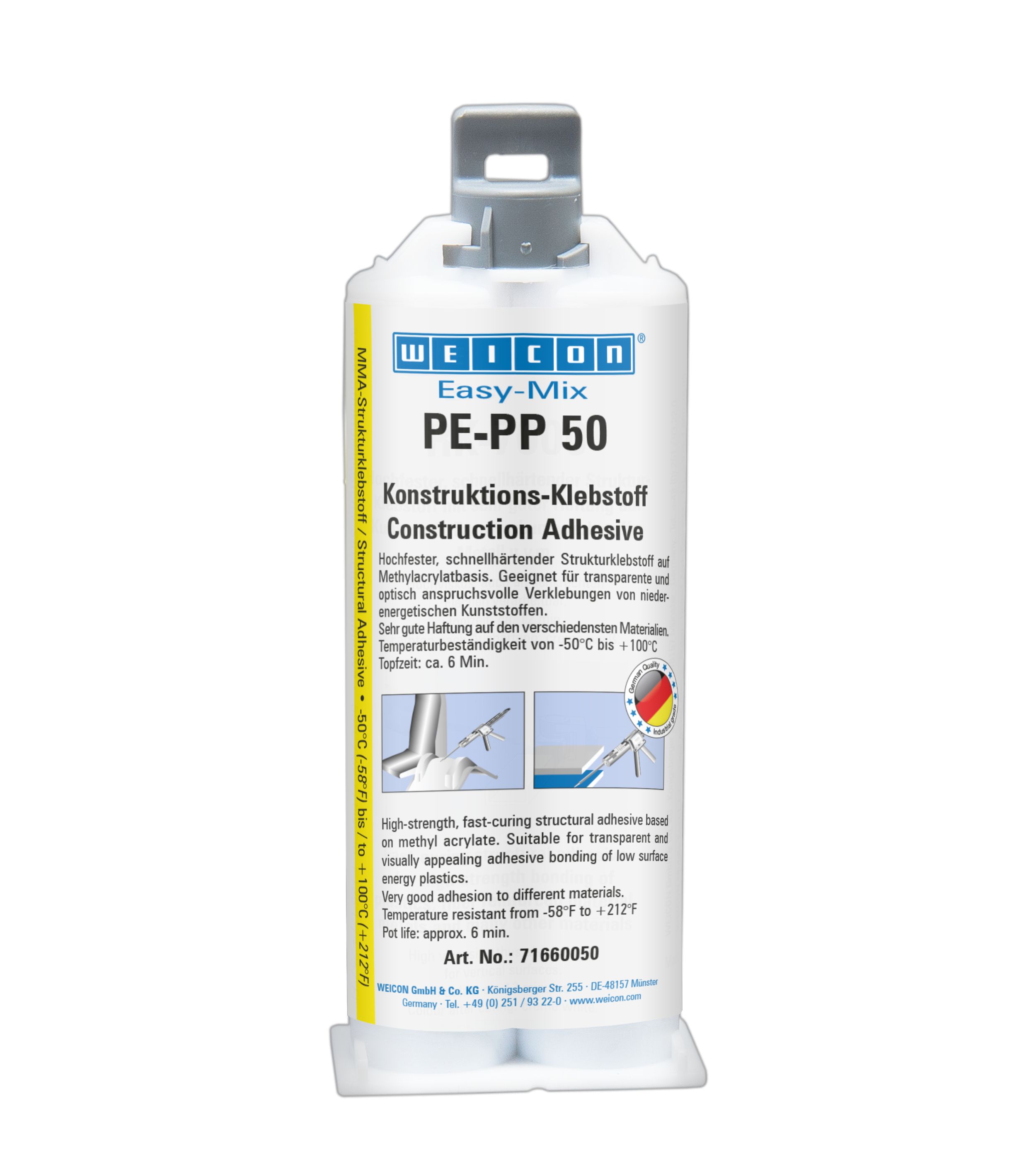 PE-PP 50 has a short pot life of six minutes and a processing time of twelve minutes. It is applied with a 1:1 system and does not require pre-treatment of the bonding surfaces, as the adhesive has an integrated primer.