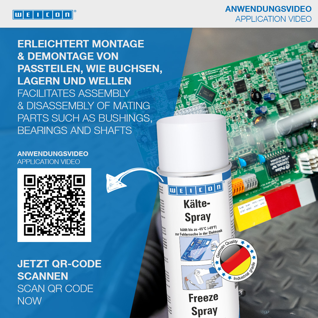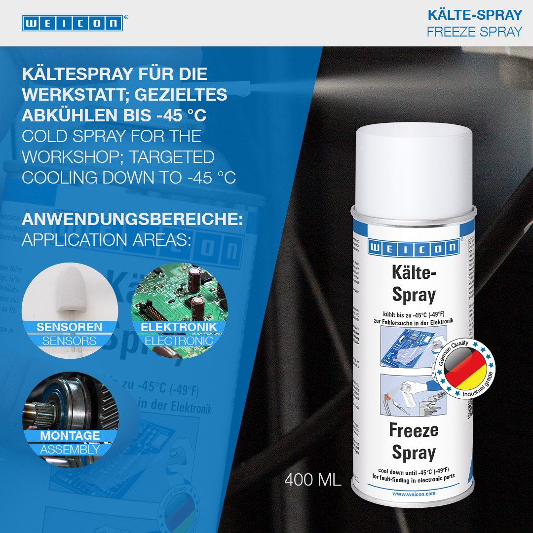 WEICON Freeze Spray memiliki banyak kegunaan dan cocok untuk menemukan kesalahan dalam elektronik dan untuk pekerjaan perbaikan di sektor industri. Freeze Spray dengan cepat mendinginkan komponen hingga -45 ° C dan memungkinkan pendinginan yang tepat bahkan pada bagian konstruksi terkecil sekalipun. WEICON Freeze Spray bersifat non-konduktif dan netral terhadap bahan (kecuali plastik) dan dapat digunakan dalam banyak aplikasi industri dan teknis.