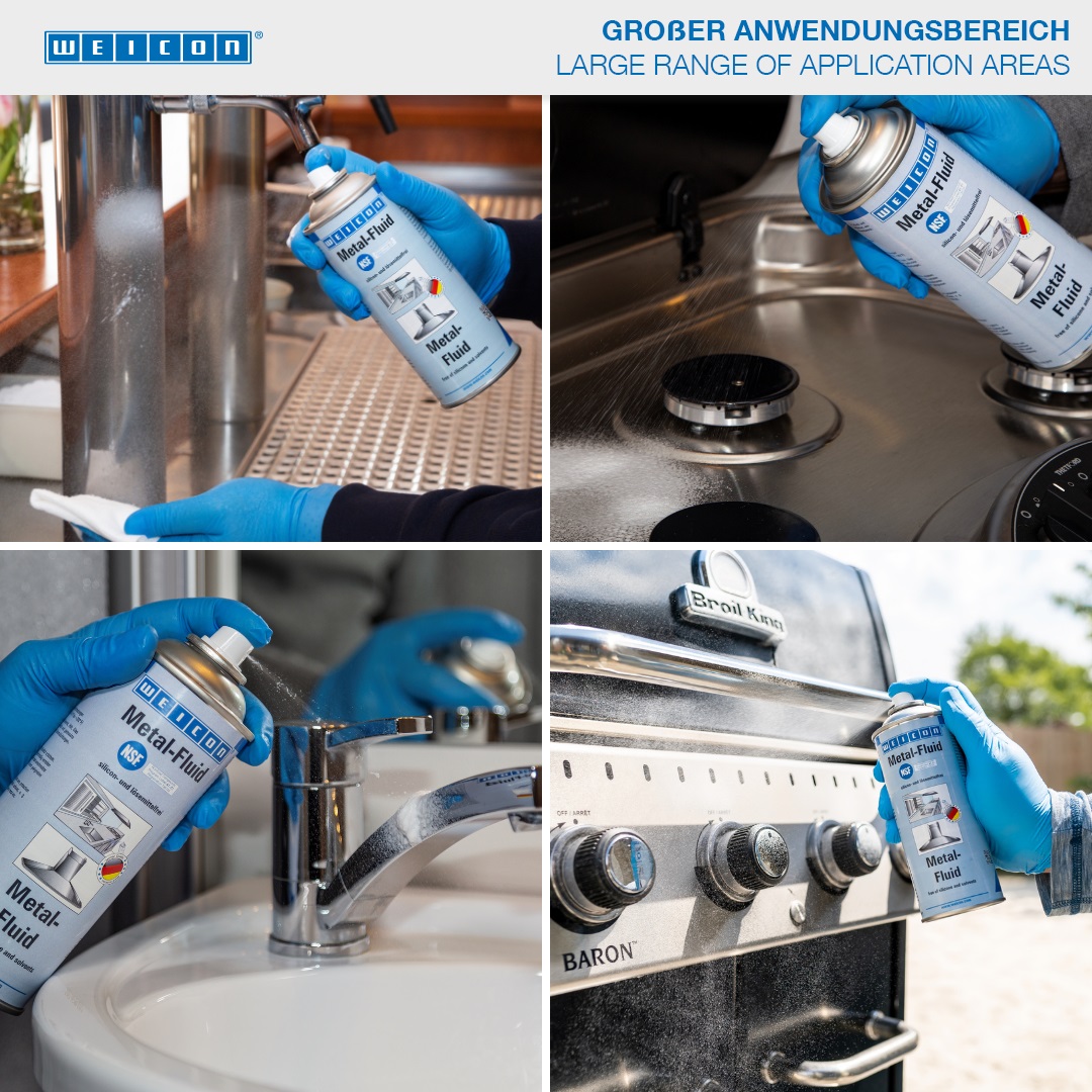 WEICON Metal-Fluid adalah produk perawatan dan pembersihan untuk permukaan matt dan permukaan yang dipoles di dalam ruangan dan memiliki registrasi NSF. Metal-Fluid melindungi, membersihkan dan merawat permukaan logam serta keramik, kayu, kaca dan plastik. Produk ini tidak melarutkan tanda yang terukir dan tercetak atau permukaan plastik dan segel karet.