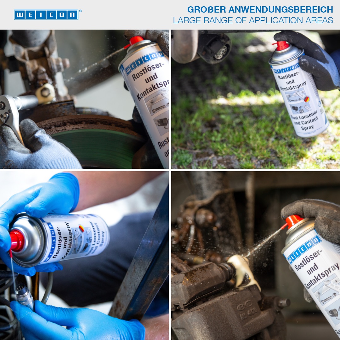 Fungsi enam kali lipat dari WEICON Rust Loosener and Contact Spray membuatnya sangat diperlukan untuk pekerjaan perbaikan, pemeliharaan dan servis. Berkat aksi kapilernya yang sangat baik, Rust Loosener dan Contact Spray dapat menjangkau ruang yang sangat sempit sekalipun. Katup semprotan 3 arah memungkinkan untuk bekerja di posisi apa pun (bahkan di atas kepala). WEICON Rust Loosener and Contact Spray melonggarkan bagian yang berkarat dan tersangkut, sekrup, baut, sambungan dan engsel, menghilangkan air dari sistem pengapian, mengamankan fungsi komponen mekanis dan kontak, misalnya pada tutup distributor dan busi, melindungi secara berkelanjutan dari korosi dan oksidasi, memberikan pelumasan yang tahan lama pada permukaan geser, dan membersihkan serta merawat permukaan logam, komponen mekanis dan sistem kelistrikan.