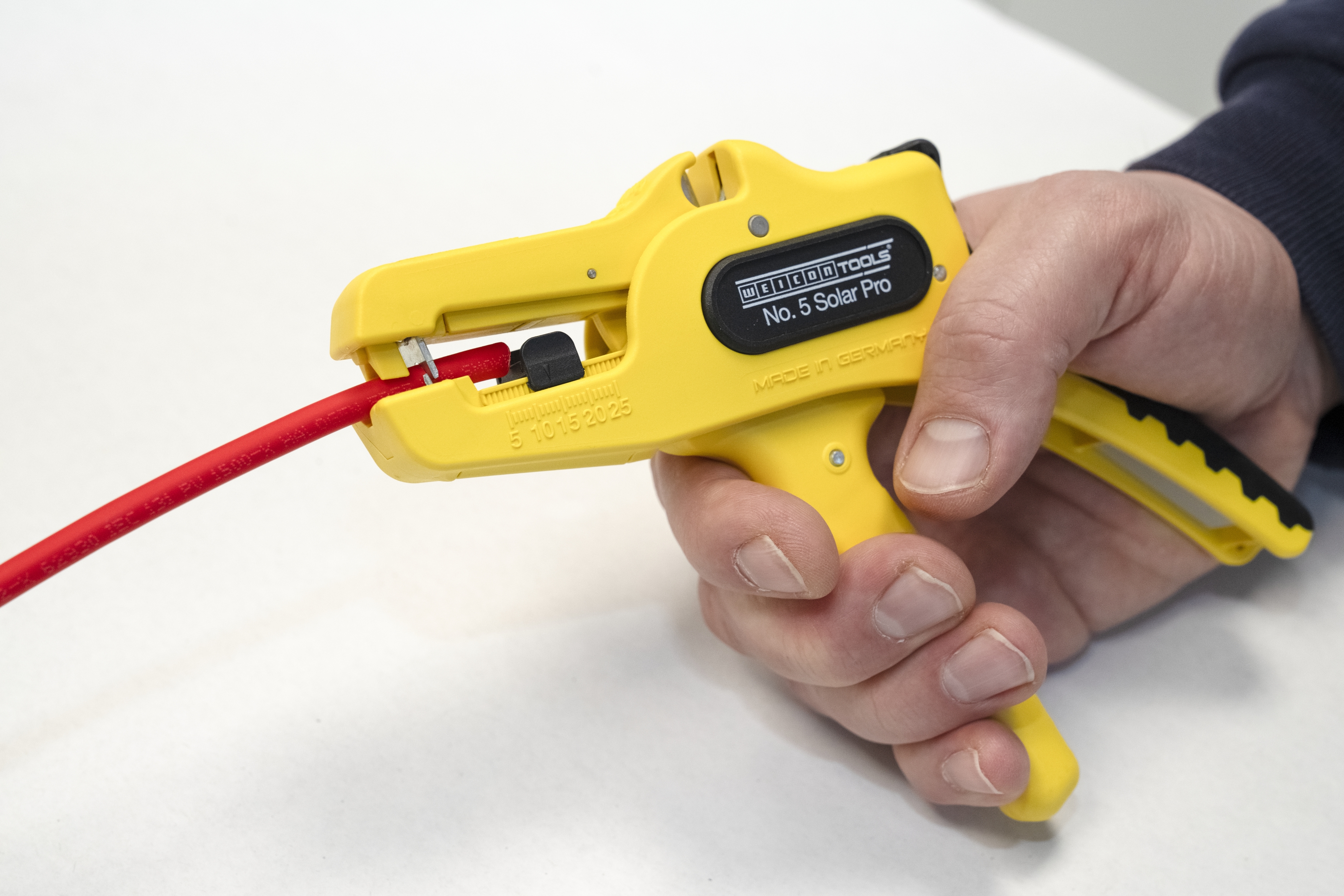 The automatic wire stripper is used to strip all common solar cables, such as H1Z2Z2-K from 1.5 to 10 mm². The adjustable length stop ranging from 5 to 25 mm ensures outstanding precision and accuracy. The knives of the Wire Stripper No. 5 Solar Pro are hardened additionally in order to easily remove multilayer rubber insulations. The length stop can be removed, if required. The wire stripper automatically adjusts to the required conductor cross-section, so no manual adjustment is necessary. The tool features an integrated side cutter, which is suitable for conductors made of copper and aluminium up to a diameter of three millimetres. Thanks to its slim design, the wire stripper can also be used in areas that are difficult to access, such as on solar modules or on the inverter. The mechanics of the tool are very smooth-running and have proven to be durable and reliable in numerous tests. The wire stripper has a non-slip multi-component handle in a yellow and black “ice crack” design. It has an eyelet to attach a strap for fall protection, and it has a labelling area where the tool can be personalised. In addition, the wire stripper has a locking mechanism for space-saving storage. As with all strippers of the product line No. 5, the galvanised blades can be replaced.