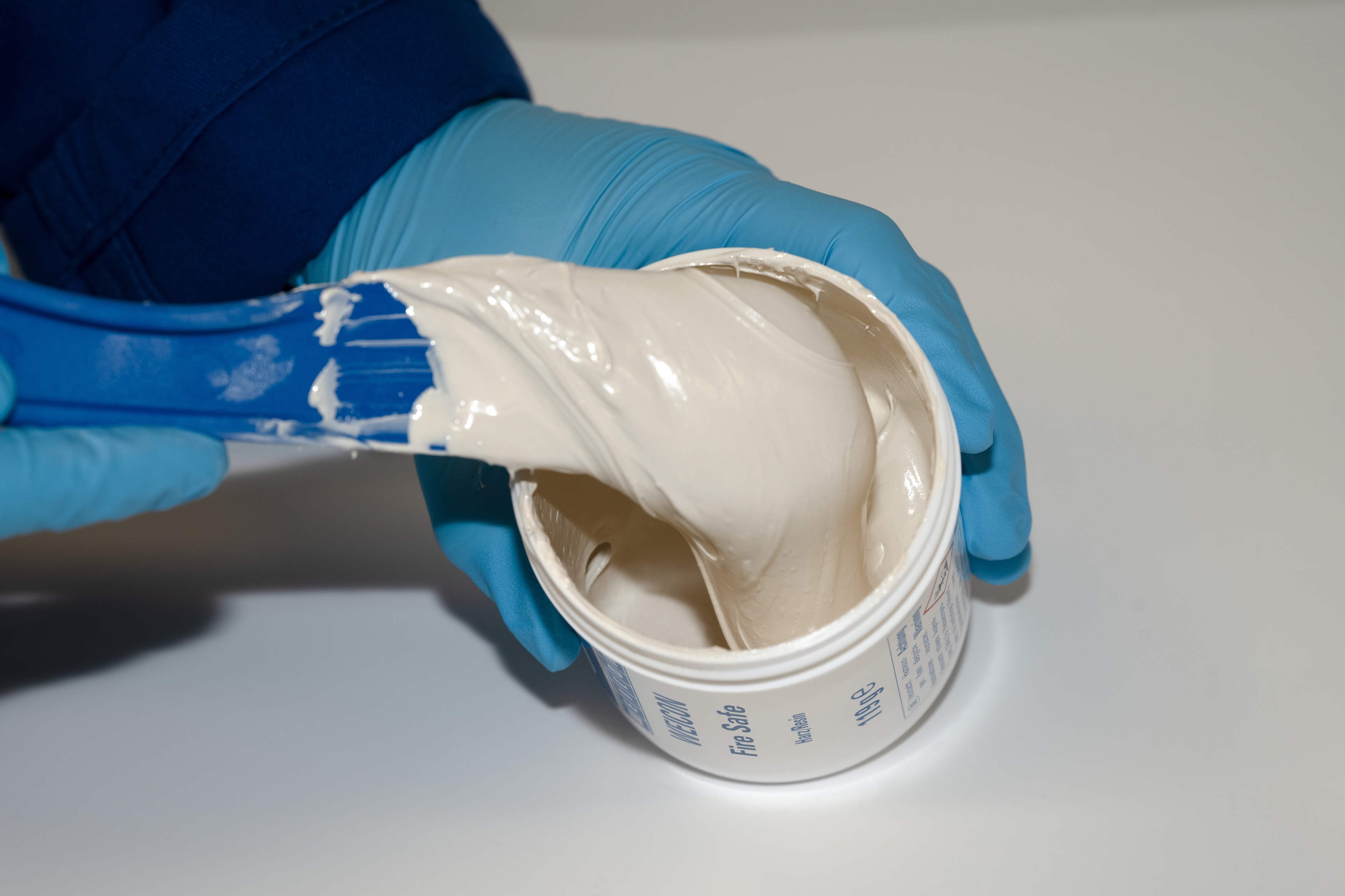 Fire Safe is a white, flame-retardant, 2-component adhesive. It has a thick consistence and can be applied with a spatula. It is suitable for applications in the fire protection sector and is used to bond wear protection ceramics or steel parts to many different surfaces, such as metal or concrete. The adhesive system has a high bonding strength, is hard-flexible after curing and has been modified to be impact-resistant. Even under the most extreme conditions, the adhesive does not become brittle. It shows good wear protection properties in particle erosion, has good chemical resistance and is solvent-free. Fire Safe contains additives that cause self-extinguishing within a few seconds. It was tested according to DIN EN ISO 340 at DMT in Dortmund and passed the test successfully.