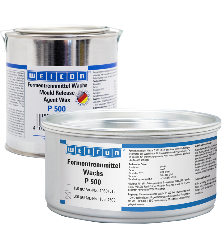 P 500 adalah bahan pelepas yang berbahan dasar lilin untuk resin epoksi dan poliuretan. Ini sangat cocok untuk proses pelepasan dari permukaan yang kasar dan/atau berpori.