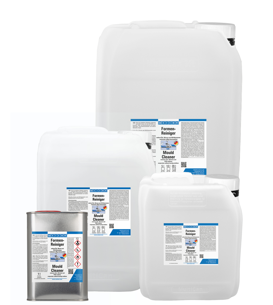WEICON Mould Cleaner secara efektif menghilangkan lilin, silikon, minyak, residu PUR yang tidak diawetkan, dan kotoran lainnya dari cetakan plastik, baja, atau aluminium.