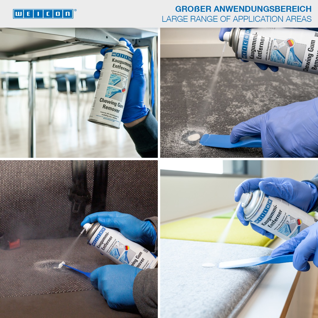 WEICON Chewing Gum Remover bahkan dapat menghilangkan sisa permen karet dan plastisin. Permen karet dan sisa plastisin akan membeku saat disemprot dengan WEICON Chewing Gum Remover dan dapat segera dilepaskan tanpa merusak tekstil atau lantai. WEICON Chewing Gum Remover dapat menghilangkan permen karet dan residu plastisin dari furnitur berlapis kain, kursi bus (busa kaku), kursi dan meja sekolah, lantai tekstil dari semua jenis dan penutup lantai yang elastis dan keras seperti lantai kayu dan batu, lantai PVC dan linoleum.