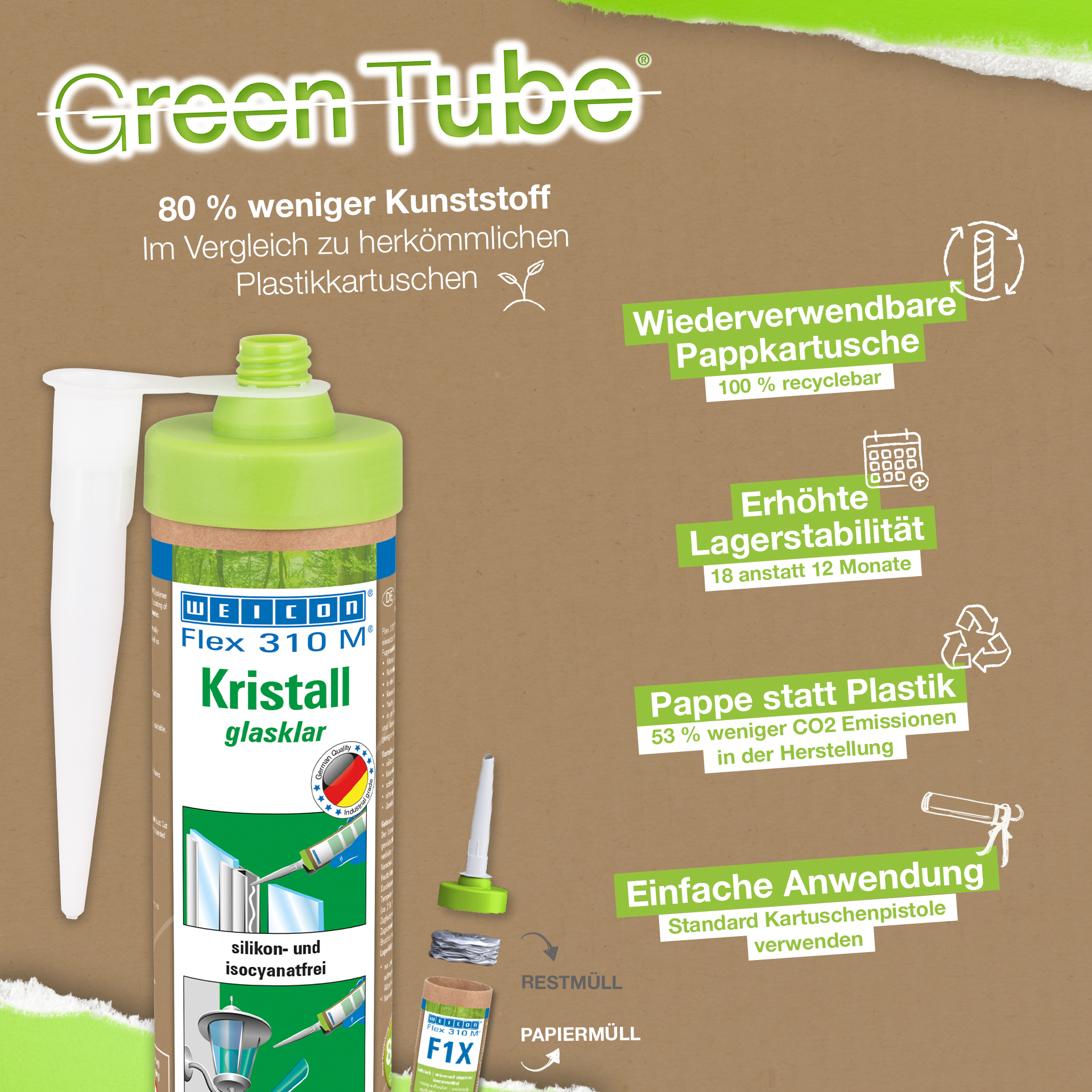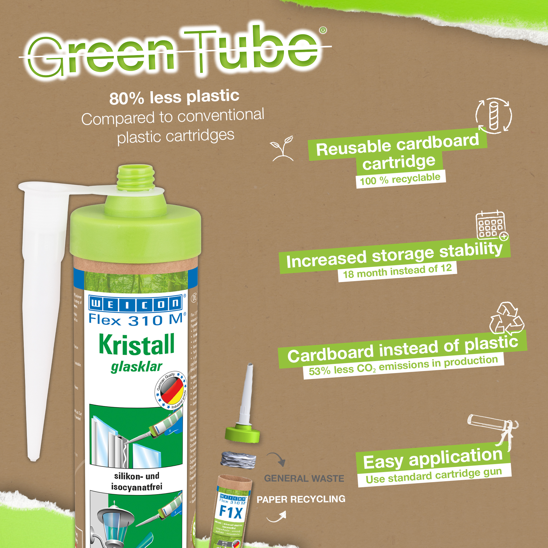 WEICON Flex 310 M Crystal transparan, kuat, dapat dicat (basah-basah), dapat diampelas, memiliki ketahanan yang luar biasa terhadap penuaan dan ketahanan yang baik terhadap sinar UV. Tidak mengandung silikon, isosianat, halogen, atau pelarut. Produk ini memiliki sertifikat ISEGA dan dapat digunakan sebagai perekat dalam teknologi makanan. Flex 310 M Crystal adalah perekat elastis yang cocok untuk merekatkan kaca, PC* dan kaca akrilik*, logam, berbagai jenis plastik, keramik, kayu, dan batu. Produk ini jernih setelah diawetkan dan sangat cocok untuk sambungan elastis di mana perekat harus atau tidak boleh terlihat. Produk ini dapat digunakan dalam pemrosesan plastik, konstruksi logam, rekayasa tangki dan peralatan, dalam sistem ventilasi dan pendingin udara, industri kelistrikan dan penerangan, dalam konstruksi stan pameran dan perlengkapan toko, dan dalam semua aplikasi di mana silikon atau produk yang mengandung silikon tidak cocok. (* = hanya untuk ikatan bebas tegangan)