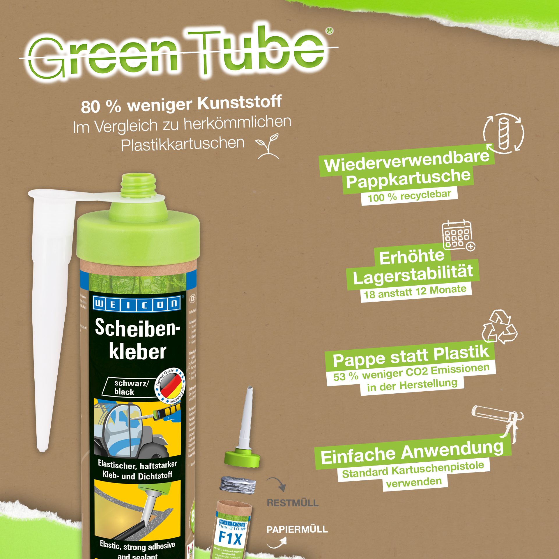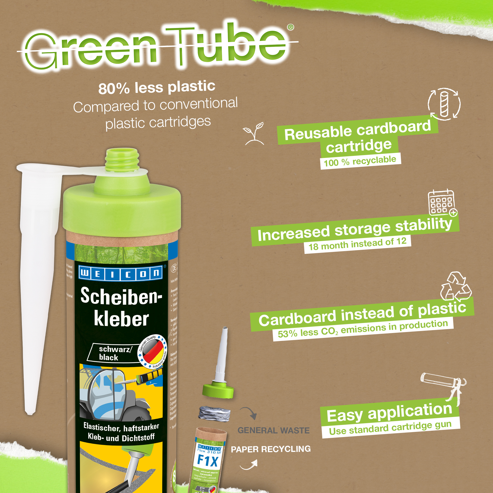WEICON Windscreen Adhesive adalah perekat dan sealant 1-C yang elastis, pucat, dan kuat berdasarkan MS-Polymer, yang secara khusus dirancang untuk merekatkan kaca dan panel jendela. Sebagai contoh, perekat ini merekatkan kaca depan, jendela belakang, dan jendela samping pada truk industri bertenaga, mesin pertanian, dan mesin konstruksi. Ini juga cocok untuk pembuatan furnitur atau untuk instalasi dalam berkebun dan lansekap. Perekat Kaca Depan memberikan kekuatan rekat yang tinggi pada banyak bahan dan menyembuhkan dengan kelembaban udara. Perekat menunjukkan ketahanan penuaan yang sangat baik dan stabilitas UV yang baik ... Perekat ini dapat mengisi sambungan, tidak berbau, dan bebas dari silikon, isosianat, halogen, dan pelarut.