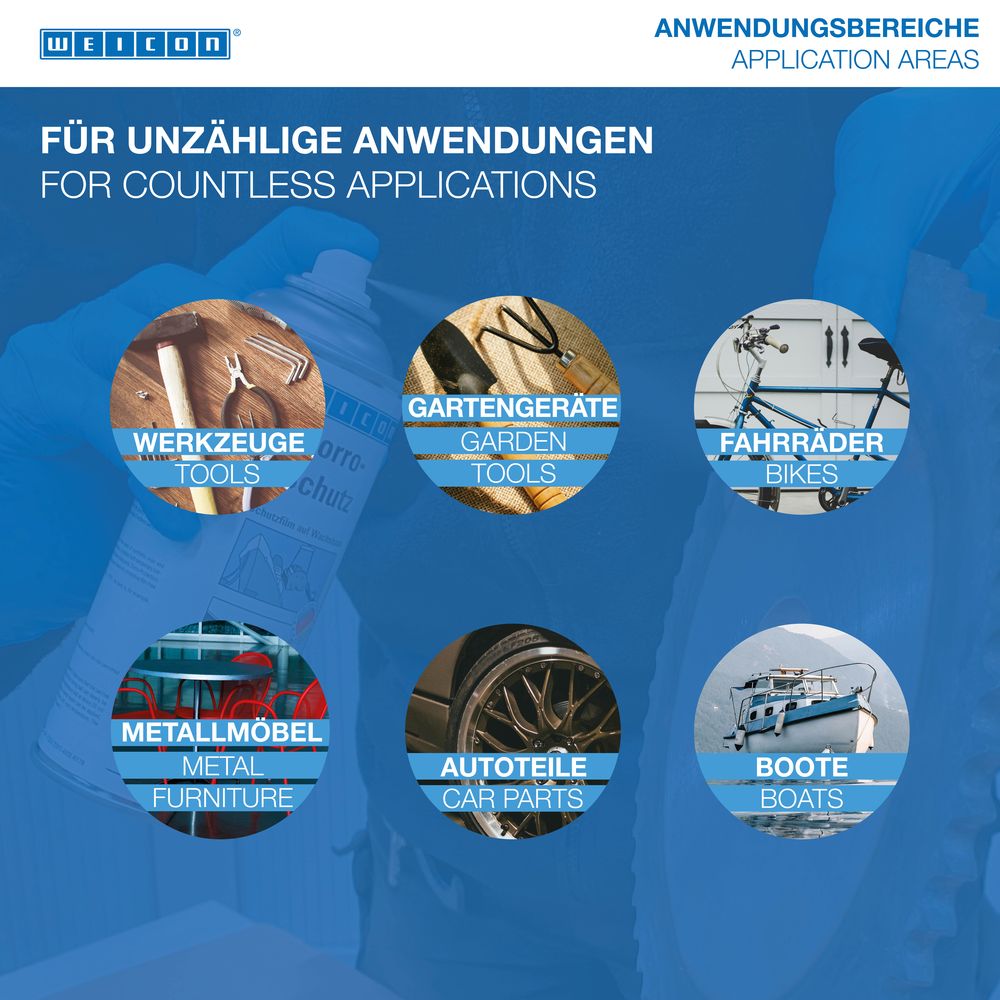 WEICON Corro-Protection adalah film pelindung yang disetujui oleh TÜV Jerman. Produk ini secara permanen melindungi perkakas logam dan komponen presisi dengan lapisan kering dan seperti lilin. WEICON Corro-Protection dapat digunakan sebagai perlindungan korosi yang aman untuk bagian logam yang tidak dicat, untuk penyimpanan benda kerja di dalam ruangan, sebagai perlindungan korosi selama pengangkutan ke luar negeri, dan untuk konservasi perkakas dan komponen presisi. Lapisan pelindung dapat dilepas dengan mudah (misalnya dengan WEICON Cleaner S).