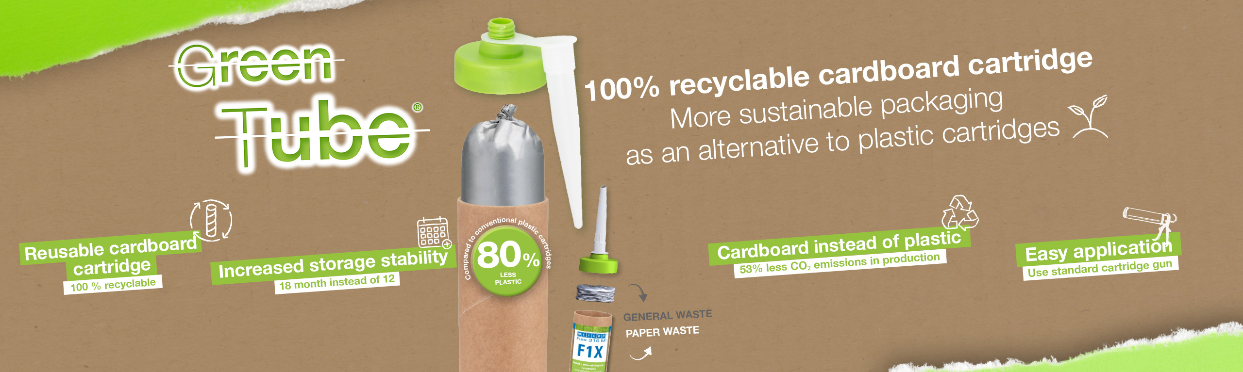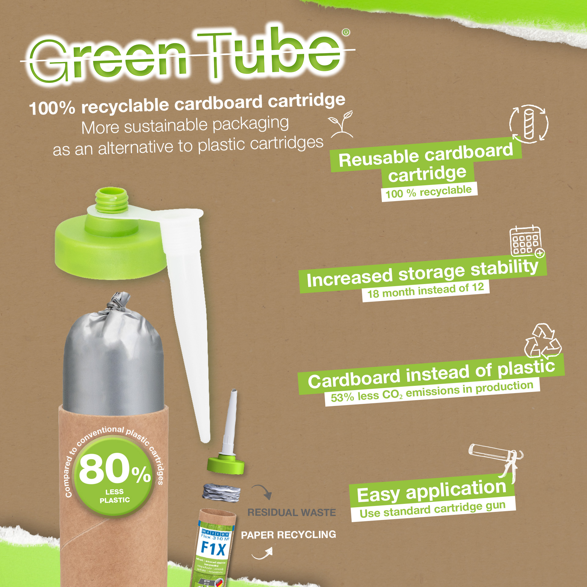 In the production of the Green Tube cartridge, 80% less plastic is used compared to conventional cartridges. The cartridge casing is made from 100% hardened cardboard. The production generates 53% less CO₂ emissions than the manufacturing of a PE cartridge – a clear benefit for the climate and the environment.