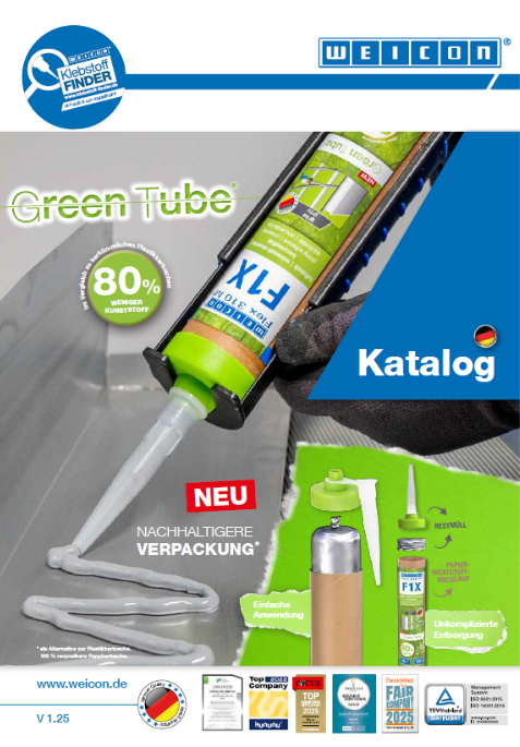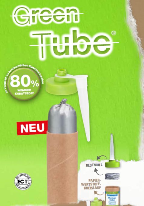 The production of the Green Tube cartridge uses 80 % less plastic than conventional cartridges. The cartridge casing is made from 100 % hardened cardboard. Production generates 53 % less CO₂ emissions than the manufacturing of a PE cartridge – a clear advantage for the climate and the environment.