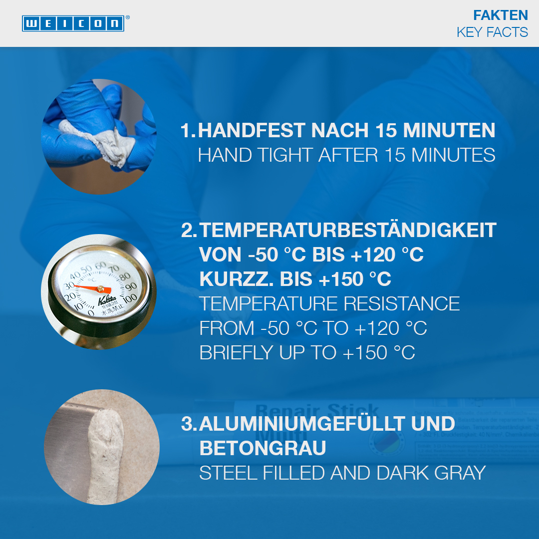 Untuk perbaikan dan pengikatan komponen logam yang cepat dan tidak korosif. Untuk perbaikan retakan, lubang dan kebocoran pada bodi mobil, kotak roda gigi dan tangki, bingkai dan profil jendela, serta kapal dan model. WEICON Repair Stick Aluminium dapat digunakan dalam konstruksi mesin dan sistem, dalam industri otomotif, dalam konstruksi roda gigi, konstruksi jendela, pembuatan model, dan banyak aplikasi lainnya.