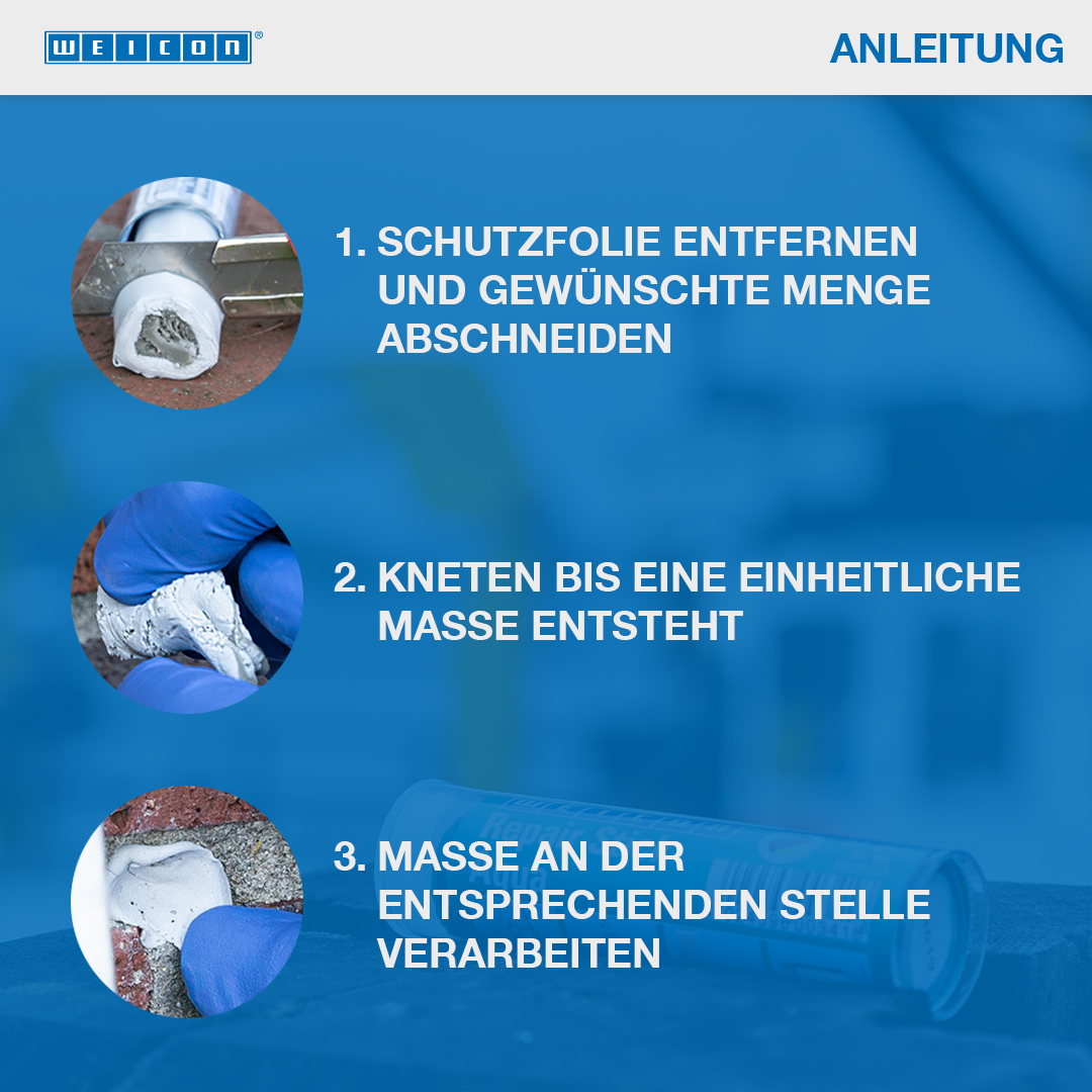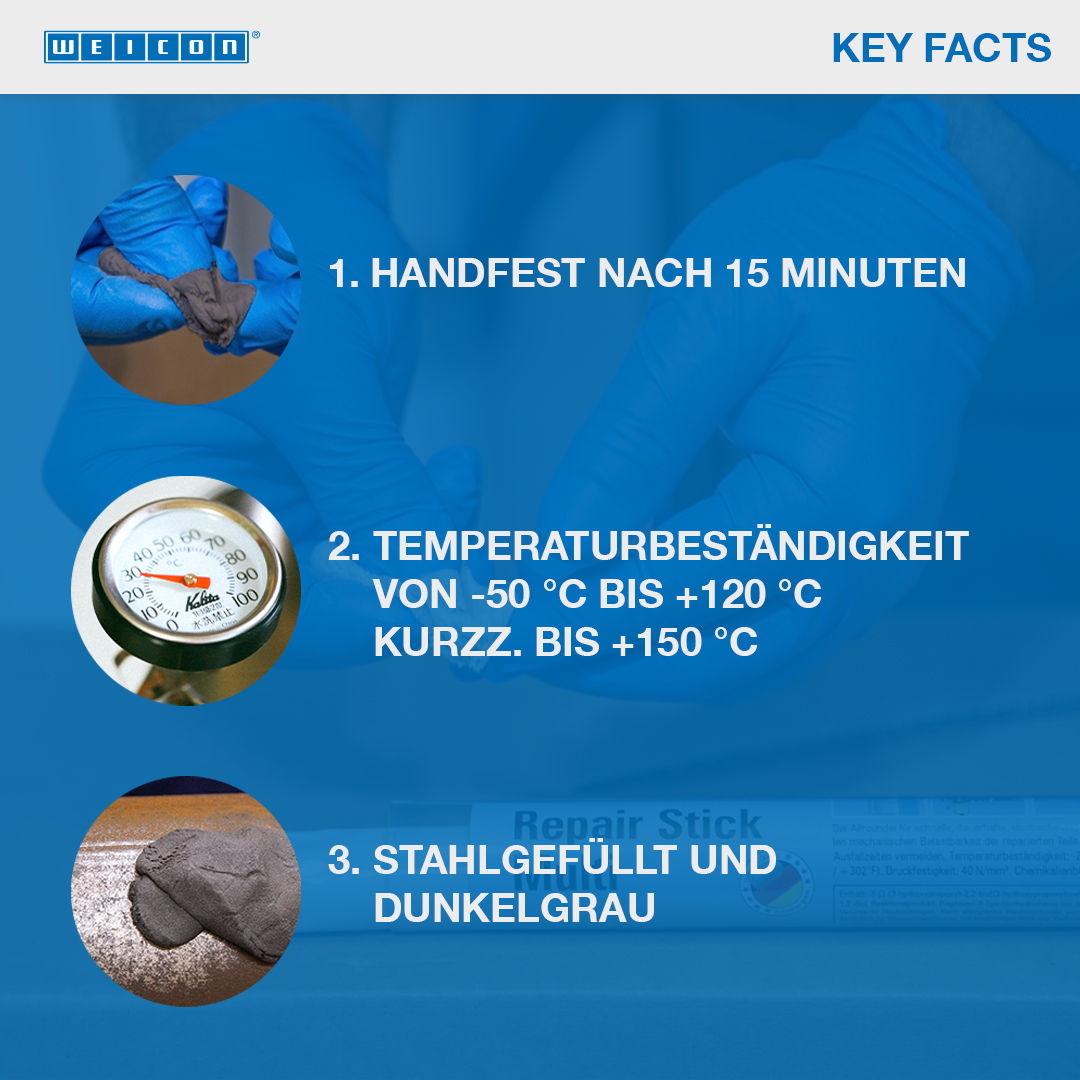 Ini sangat cocok untuk perbaikan dan pengikatan komponen logam yang cepat dan berkekuatan tinggi serta untuk menambal dan menyegel retakan, lubang, dan kebocoran pada komponen mesin, tangki dan saluran pipa, kontainer, pompa dan rumah, pagar balkon, pegangan tangga, dan ulir yang robek. WEICON Repair Stick Steel dapat digunakan dalam konstruksi mesin dan sistem, dalam konstruksi tangki dan rekayasa peralatan, dalam industri makanan, kosmetik dan farmasi dan dalam banyak aplikasi lainnya.