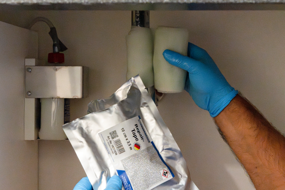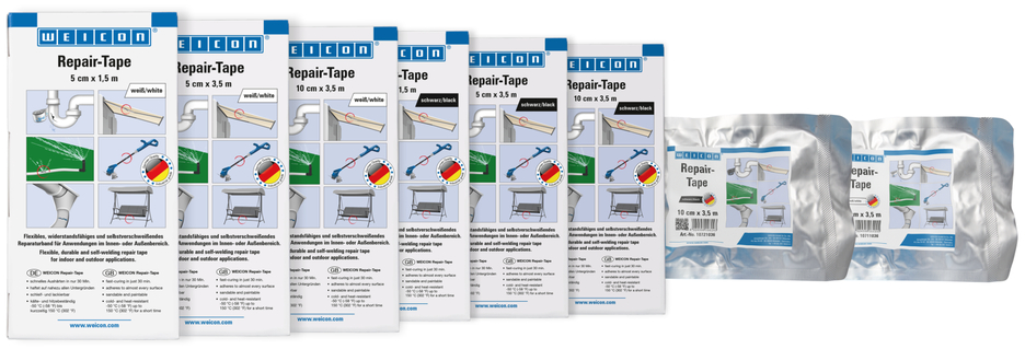 Repair-Tape yang fleksibel, tahan lama, dan dapat melebur sendiri yang terbuat dari plastik yang diperkuat serat kaca untuk perbaikan darurat yang cepat di area dalam atau luar ruangan. Selotip ini direndam dengan resin khusus dan diaktifkan melalui kontak dengan air; Dapat diaplikasikan dengan sangat mudah dan cepat serta menunjukkan kekuatan rekat yang sangat tinggi pada hampir semua permukaan. Setelah hanya 30 menit, selotip ini sepenuhnya sembuh dan tahan lama. Setelah diawetkan, selotip dapat diampelas dan dicat ulang. Ini memiliki ketahanan kimia dan suhu yang tinggi - dari 50 ° C / (-58 ° F) hingga +150 ° C (302 ° F) untuk waktu yang singkat. Selotip dapat diaplikasikan tanpa alat tambahan dan digunakan untuk perbaikan yang andal dan tahan lama dalam aplikasi industri, perdagangan terampil, di sekitar rumah, dan di sektor berkemah dan DIY;