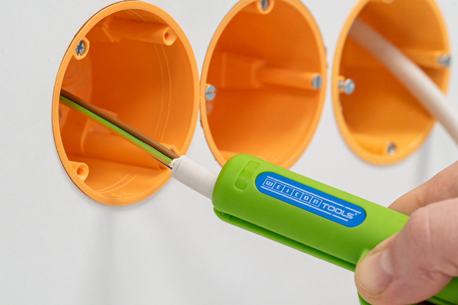 Alat pengupas dengan Green Line, rangkaian alat yang sangat istimewa telah dikembangkan. Alat-alat ini terbuat dari hingga 97% bahan baku yang dapat didaur ulang dan memiliki penilaian siklus hidup yang sangat baik. Round Cable Stripper No. 13 Green Line memungkinkan pengupasan yang cepat dan mudah untuk semua kabel bundar dan kabel ruang basah yang umum dengan diameter 6,0 - 13,0 mm (misalnya kabel NYM 3 x 1,5 mm² hingga 5 x 2,5 mm²). Menyesuaikan kedalaman pemotongan secara manual tidak diperlukan. Dengan demikian, jangkauan kerja yang baru ini juga cocok untuk diameter kawat yang lebih kecil dari 6 mm, seperti 3 x 0,75 mm². Berkat bentuk gagang yang ergonomis, alat ini sangat nyaman digunakan. Gagang khas Round Cable Stripper No. 13 memastikan pegangan yang aman dan tidak licin. Hal ini membantu mempermudah pekerjaan sehari-hari dan juga meningkatkan keselamatan kerja. Kepala alat yang bulat dan hemat tempat sangat cocok dengan geometri kotak dinding modern. Bentuknya yang lebih panjang membuat akses lebih mudah ketika melakukan pengupasan pada kotak dinding yang memiliki rongga dan ruang yang sulit dijangkau. Karena pengaturan pisau baru, penyumbatan pisau elektro-galvanis yang disebabkan oleh residu selubung kabel dapat dicegah, untuk rangkaian kecil yang memungkinkan atau untuk memproduksi kabel dengan panjang strip yang sama, Lenght Stop diintegrasikan ke dalam housing. Penjepit pengikat memastikan penyimpanan alat yang aman.