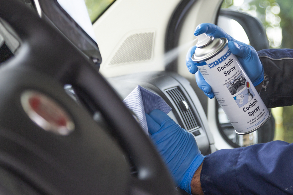 WEICON Cockpit Spray adalah produk perawatan anti air untuk semua komponen plastik dan karet serta untuk permukaan kayu yang dipernis pada interior kendaraan bermotor. Lapisan pelindung permanen yang tidak terlihat mencegah kontaminasi dan menciptakan kilau halus yang mudah dirawat dan menolak debu. Cockpit-Spray menyegarkan kembali plastik yang kusam dan lapuk. Karet tidak retak dan tetap lentur dan elastis. WEICON Cockpit-Spray menghilangkan suara berderit dan berderit serta menjaga dasbor, kelongsong bagian dalam, semua bagian plastik dan karet, kulit, kayu, dan kromium, serta atap mobil yang dilapisi kulit sintetis. Produk ini mencegah segel pintu, jendela, dan bagasi membeku dan digunakan sebagai pelumas untuk sabuk pengaman, pemandu kursi, sunroof, pemandu jendela, kunci pintu, dan di mana saja yang dapat menimbulkan kotoran.