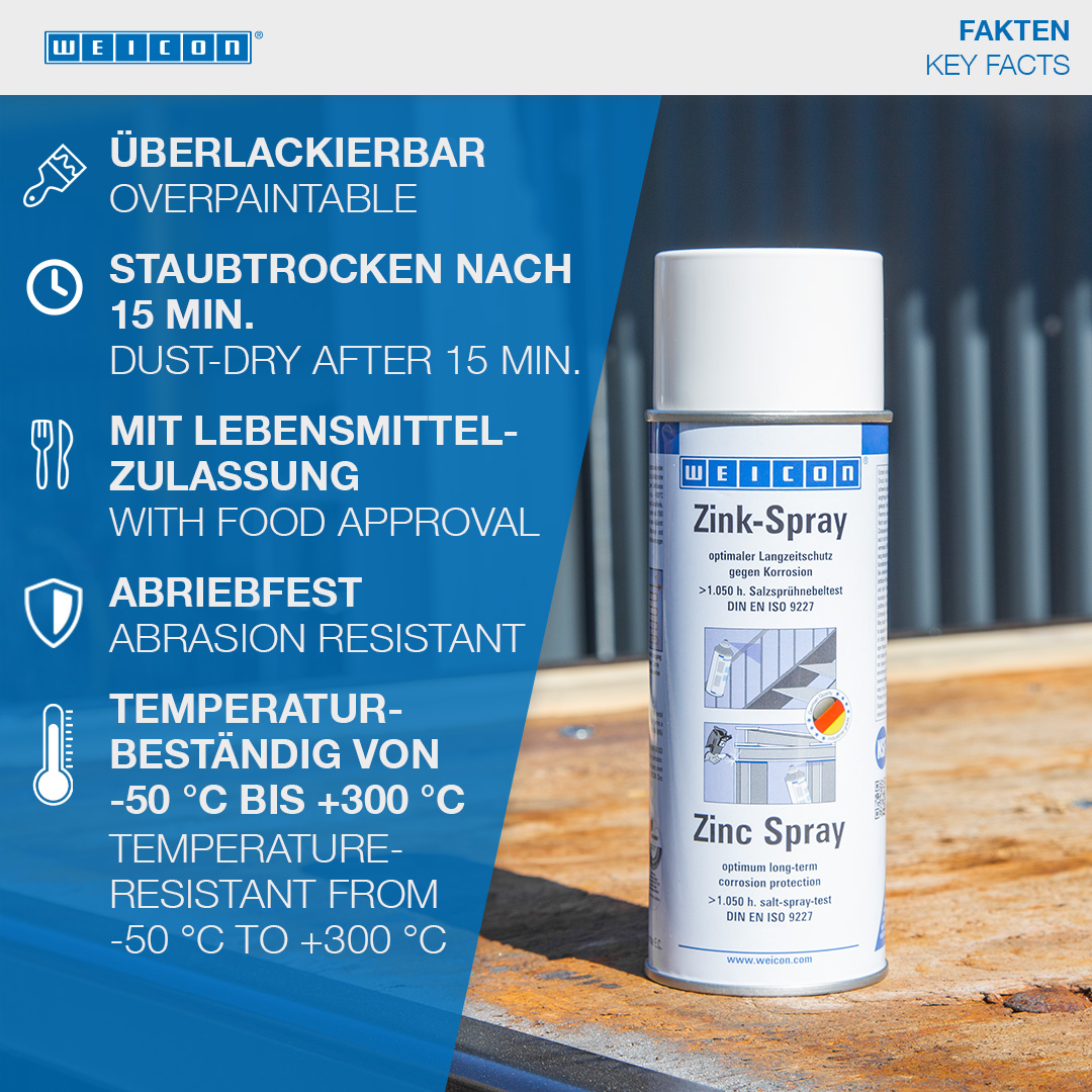 WEICON Zinc Spray telah disetujui oleh TÜV Jerman dan memberikan perlindungan korosi katodik yang tahan lama pada semua permukaan logam. Produk ini membentuk lapisan pelindung serpihan seng mikro yang cepat kering dan melekat. Bahkan setelah lebih dari 1050 jam dalam uji semprotan garam menurut DIN EN ISO 9227, bagian logam yang dilapisi dengan WEICON Zinc Spray tidak menunjukkan tanda-tanda korosi. Serpihan seng membentuk lapisan pelindung yang tahan bahkan terhadap cuaca dan kondisi lingkungan yang ekstrem. Dengan begitu, WEICON Zinc Spray memenuhi persyaratan yang lebih tinggi daripada yang ditentukan oleh standar DIN EN ISO 1461. WEICON Zinc Spray dapat digunakan sebagai primer anti karat bermutu tinggi, untuk pelapisan sambungan las dan lubang bor, sebagai lapisan perantara konduktif untuk pengelasan titik dan di mana pun logam harus dilindungi dari korosi.