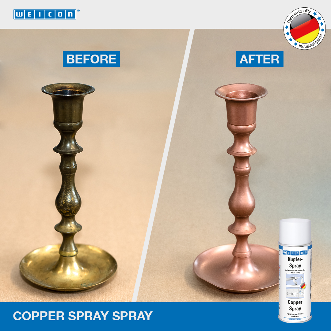 WEICON Copper Spray adalah semprotan logam berkualitas tinggi dan tahan cuaca dengan kekuatan rekat tinggi dan kandungan tembaga yang tinggi untuk pelapis pelindung dan dekoratif dengan karakter logam non-besi yang menarik untuk penggunaan di dalam dan di luar ruangan. Bahkan digunakan untuk penyempurnaan optik (pelapisan tembaga) pada berbagai permukaan material atau bagian desain. Copper Spray dapat digunakan pada kusen jendela, talang air dan downspouts, lampu luar ruangan dan kotak surat, serta untuk seni dan kerajinan dan pekerjaan dekoratif.