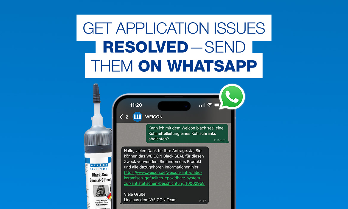 Would you like to contact us anytime and anywhere, send us photos of your application or use the WEICON TOOLS Finder? Do you have questions about our products, are you looking for the right contact person or would you like to order via WhatsApp quickly and easily? We have made all this possible for you! Use our WhatsApp service or subscribe to our WhatsApp newsletter or our new WhatsApp channel.