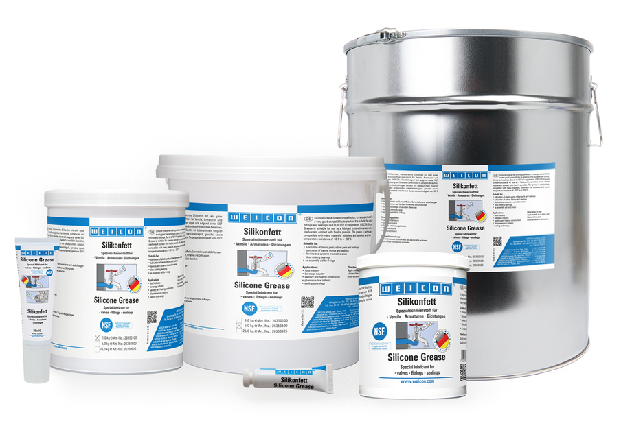 WEICON Silicone Grease sangat rekat, transparan, dan sangat kompatibel dengan plastik. Karena registrasi NSF H1-nya, gemuk ini cocok sebagai pelumas untuk katup, alat kelengkapan, dan segel di area sensitif. WEICON Silicone Grease ini sesuai dengan Pedoman Penilaian Higienis Bahan Organik yang Bersentuhan dengan Air Minum (pedoman KTW) oleh Badan Lingkungan Federal Jerman. Ini dapat digunakan dalam industri makanan dan minuman, dalam konstruksi sanitasi dan pemanas, dalam industri farmasi serta dalam teknologi penyegelan. WEICON Silicone Grease telah teruji keamanannya oleh Institut Federal Jerman untuk Penelitian dan Pengujian Bahan (BAM) - lih. selebaran 034-1 "Daftar bahan non-logam untuk digunakan dalam oksigen" (informasi DGUV 213-075) dari BG RCI. WEICON Silicone Grease ini sangat ramah lingkungan, tidak berbau dan tidak berasa serta memiliki ketahanan suhu -50°C hingga +200°C. WEICON Silicone Grease cocok untuk pelumasan komponen plastik, komponen karet dan segel, katup, fitting dan gasket, untuk perangkat dan sistem serta sebagai alat bantu perakitan cincin-O.