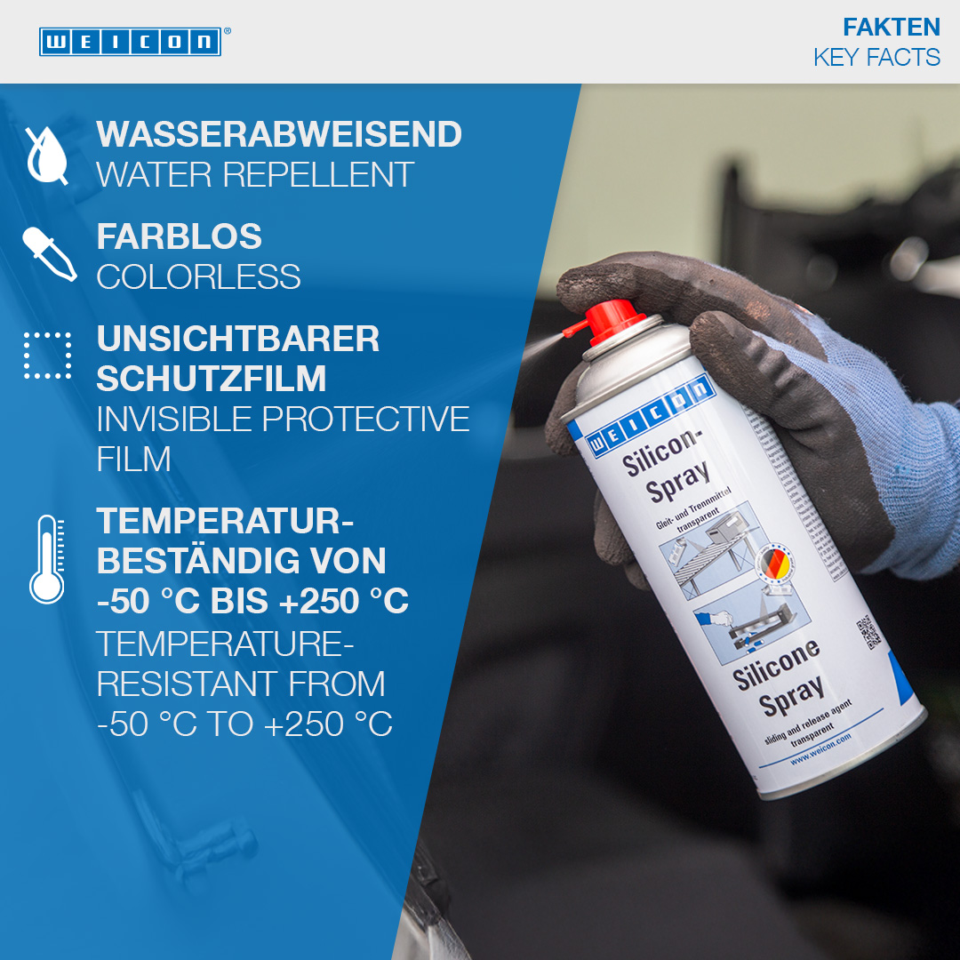 WEICON Silicone Spray adalah bahan peluncur dan pelepas serta pengawet dan produk perawatan untuk plastik, karet, dan logam. Semprotan ini memberikan lapisan pemisah yang tahan lama dan sifat permukaan yang baik serta tahan terhadap suhu hingga +250°C (+482°F). Silicone Spray mencegah pembentukan residu perekat pada pengepres dan pemandu, mencegah produk menempel pada ban berjalan, parasut, dan jalur geser, melindungi kontak listrik dari kelembapan, mengawetkan komponen karet, plastik, dan logam, melindungi komponen karet agar tidak rapuh, membeku, dan menempel, serta memungkinkan rel sunroof, jalur dudukan, dan sabuk pengaman berjalan dengan lancar.