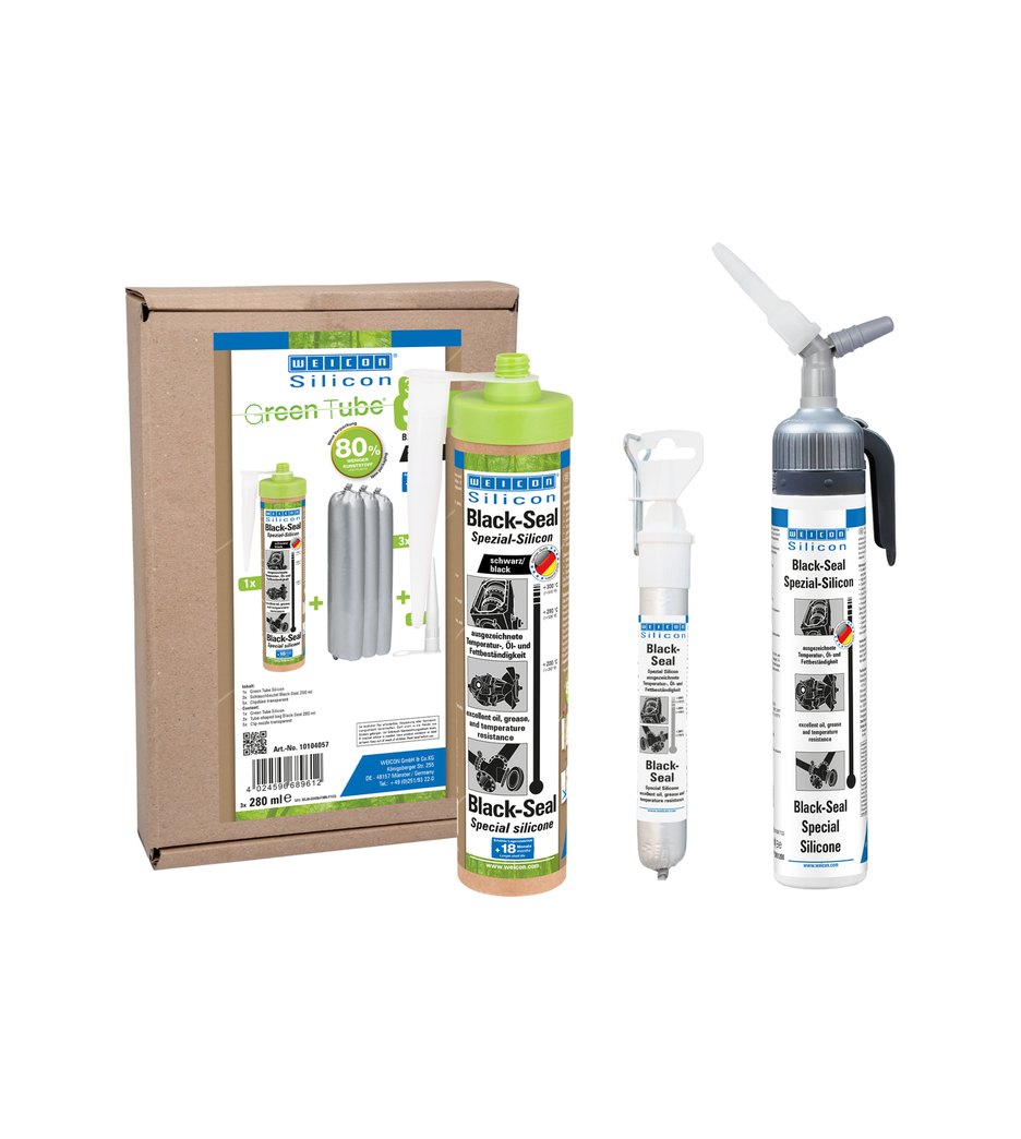 WEICON Black-Seal berwarna hitam, tahan suhu tinggi (+280 ° C/+536 ° F), bebas pelarut, kuat, tahan minyak, tahan minyak, tahan tekanan, tahan terhadap penuaan dan sangat elastis (perpanjangan putus sekitar 500%). Sangat cocok untuk pengikatan dan penyegelan pada aplikasi yang membutuhkan ketahanan minyak dan lemak yang tinggi. Produk ini dapat digunakan pada gearbox, penutup katup dan casing, bak oli, pompa air, roda gigi dan as roda, flensa, tangki dan wadah, dan di banyak area lainnya.