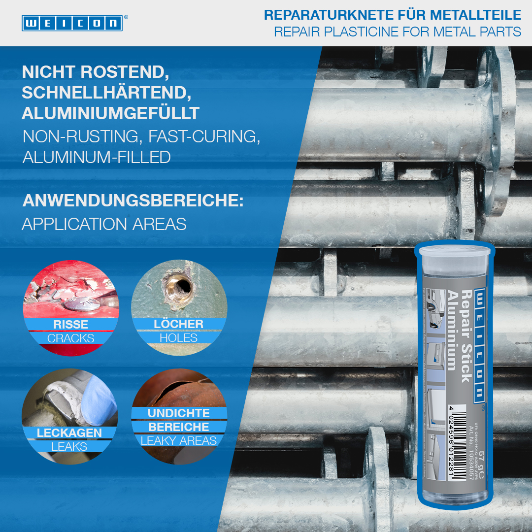 Untuk perbaikan dan pengikatan komponen logam yang cepat dan tidak korosif. Untuk perbaikan retakan, lubang dan kebocoran pada bodi mobil, kotak roda gigi dan tangki, bingkai dan profil jendela, serta kapal dan model. WEICON Repair Stick Aluminium dapat digunakan dalam konstruksi mesin dan sistem, dalam industri otomotif, dalam konstruksi roda gigi, konstruksi jendela, pembuatan model, dan banyak aplikasi lainnya.