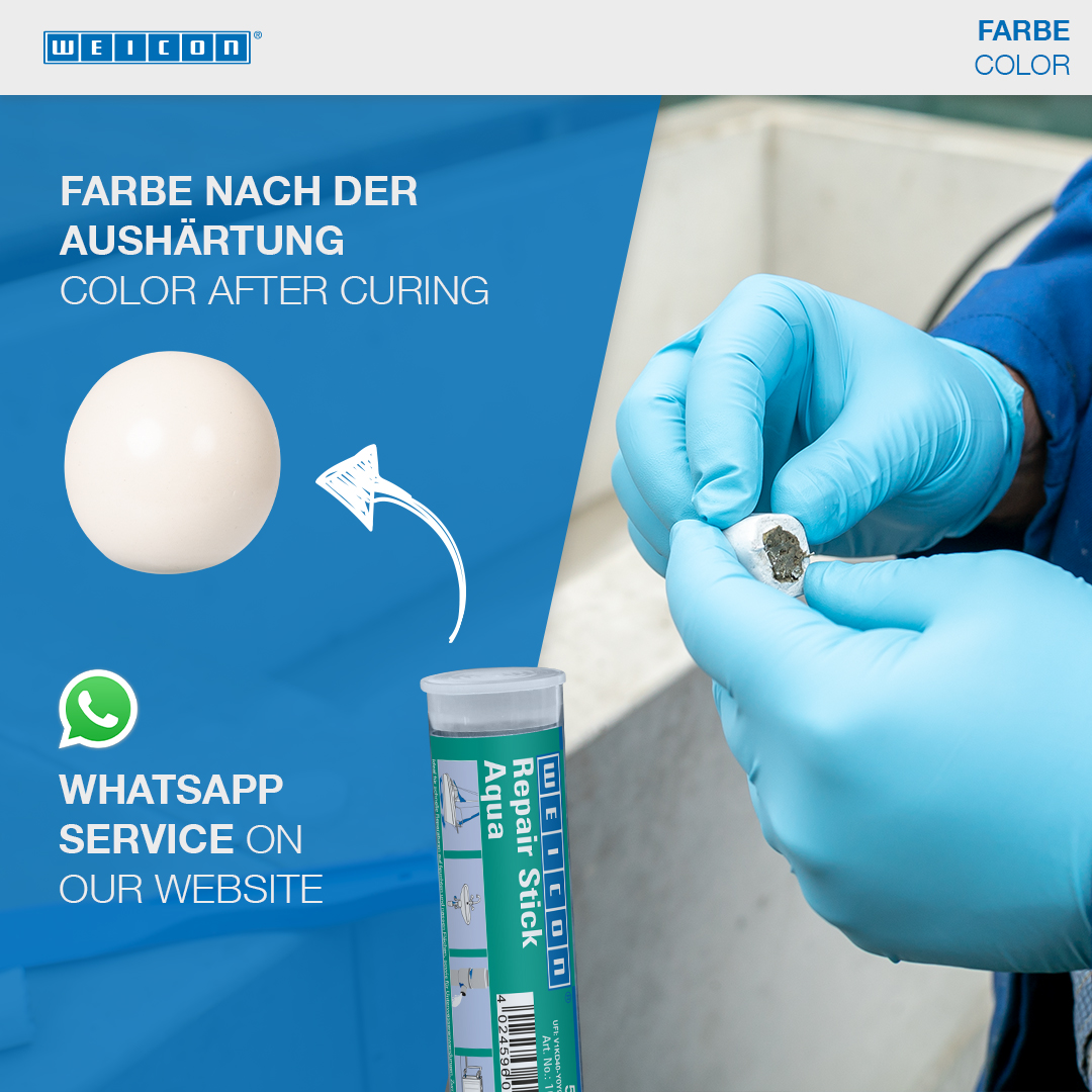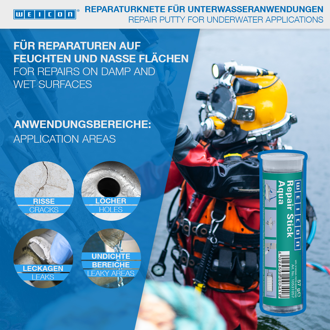 Ideal untuk perbaikan cepat pada permukaan yang lembab dan basah dan untuk aplikasi di bawah air. Untuk perbaikan dan penyegelan retakan, lubang dan kebocoran pada tangki bensin dan air, radiator, switchboard listrik, instalasi sanitasi dan kolam renang. WEICON Repair Stick Aqua dapat digunakan dalam konstruksi sistem sanitasi dan pemanas, peralatan listrik, sektor maritim, dan banyak aplikasi industri lainnya.