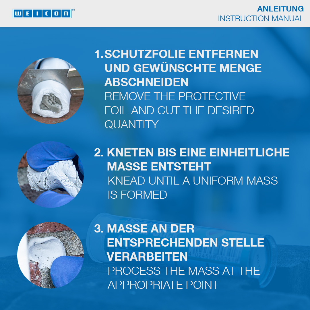 WEICON Repair Stick Plastic dikembangkan secara khusus untuk perbaikan permanen komponen plastik dan material komposit dengan elastisitas sisa seperti kusen jendela dan pintu, panel dan bumper. Sangat cocok untuk merekatkan potongan logam, seperti pipa dan belokan pipa, alat kelengkapan dan flensa, tangki air, pompa, dan rumah. Tongkat Perbaikan dapat digunakan dalam konstruksi tangki dan rekayasa peralatan, dalam industri makanan, kosmetik dan farmasi dan dalam banyak aplikasi lainnya.