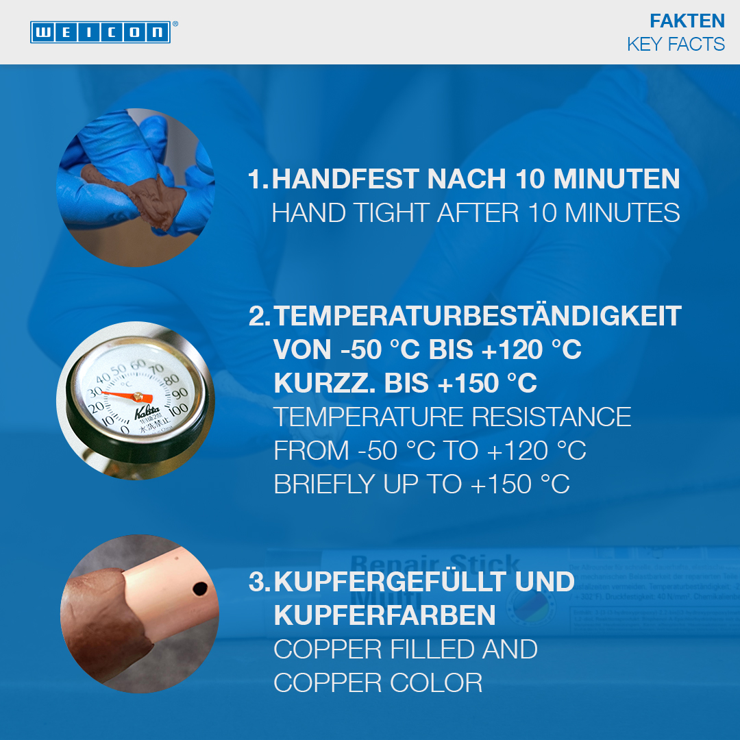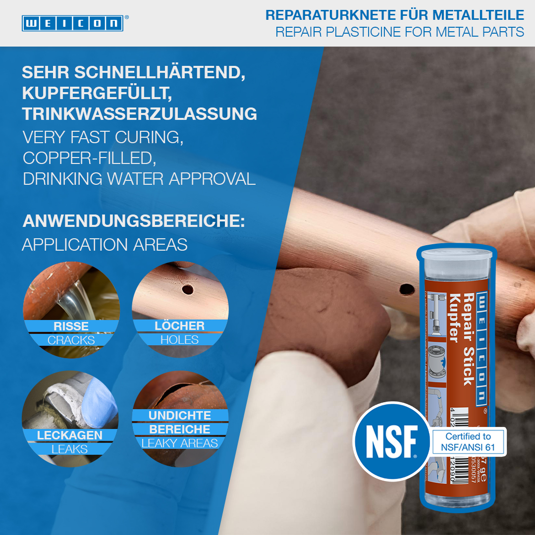 WEICON Repair Stick Copper cocok untuk perbaikan yang sangat cepat dan memperbaiki retakan, kebocoran dan kebocoran. Sistem resin epoksi memiliki waktu kerja yang sangat cepat yaitu hanya tiga menit dan juga dapat digunakan pada permukaan yang lembab dan basah. Dengan tongkat ini, pipa dan belokan pipa, fitting dan flensa, talang dan lembaran tembaga, pemanas air, tangki air, pipa air panas dan dingin, serta sistem pendingin dan pendingin udara dapat diperbaiki dan diperbaiki dengan cepat dan mudah. Tongkat Perbaikan WEICON Repair Stick Copper dapat digunakan dalam konstruksi tangki dan rekayasa peralatan, dalam industri makanan, kosmetik dan farmasi dan dalam banyak aplikasi lainnya.