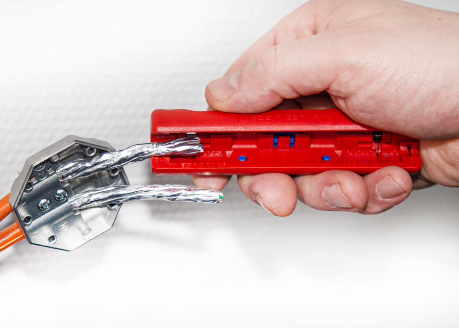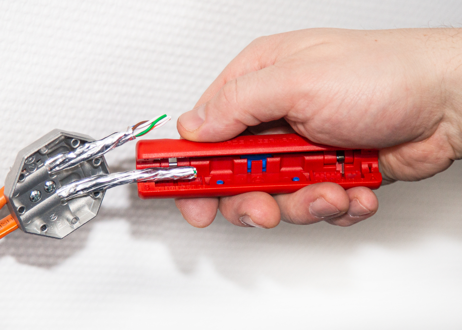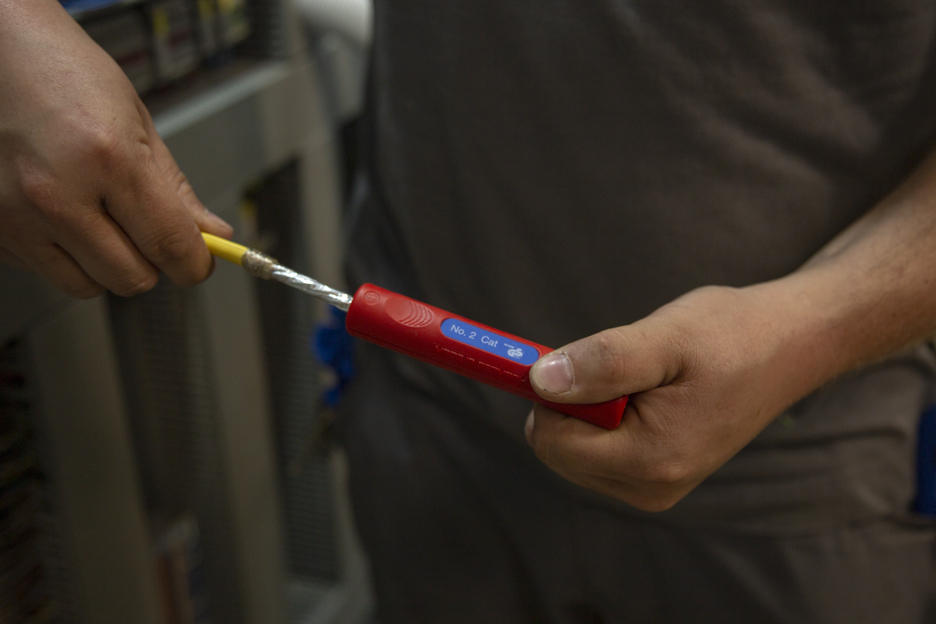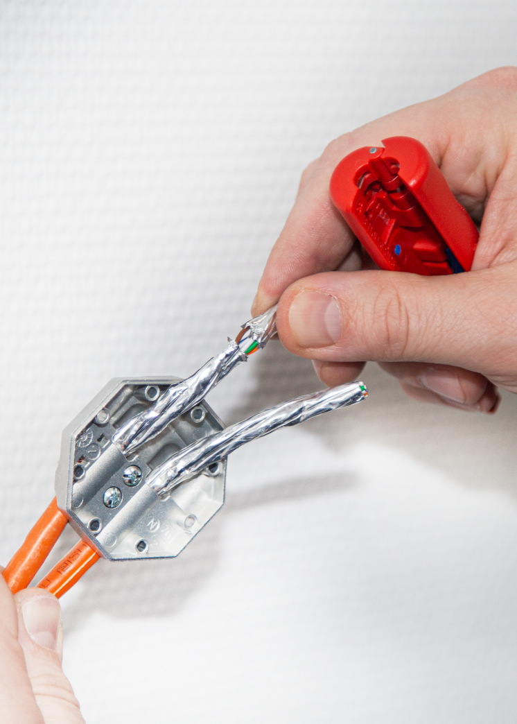 untuk kabel data PVC berinsulasi (mis. Cat5, Cat6, Cat7, kabel twisted pair) dengan diameter 4,5 - 10 mm penyesuaian kedalaman pemotongan tidak diperlukan, penyesuaian pisau yang tepat akan menghilangkan jaket luar secara akurat. Dengan mata pisau kedua, pelindung foil dibelah dengan hati-hati dan kemudian dapat dengan mudah dilepas.