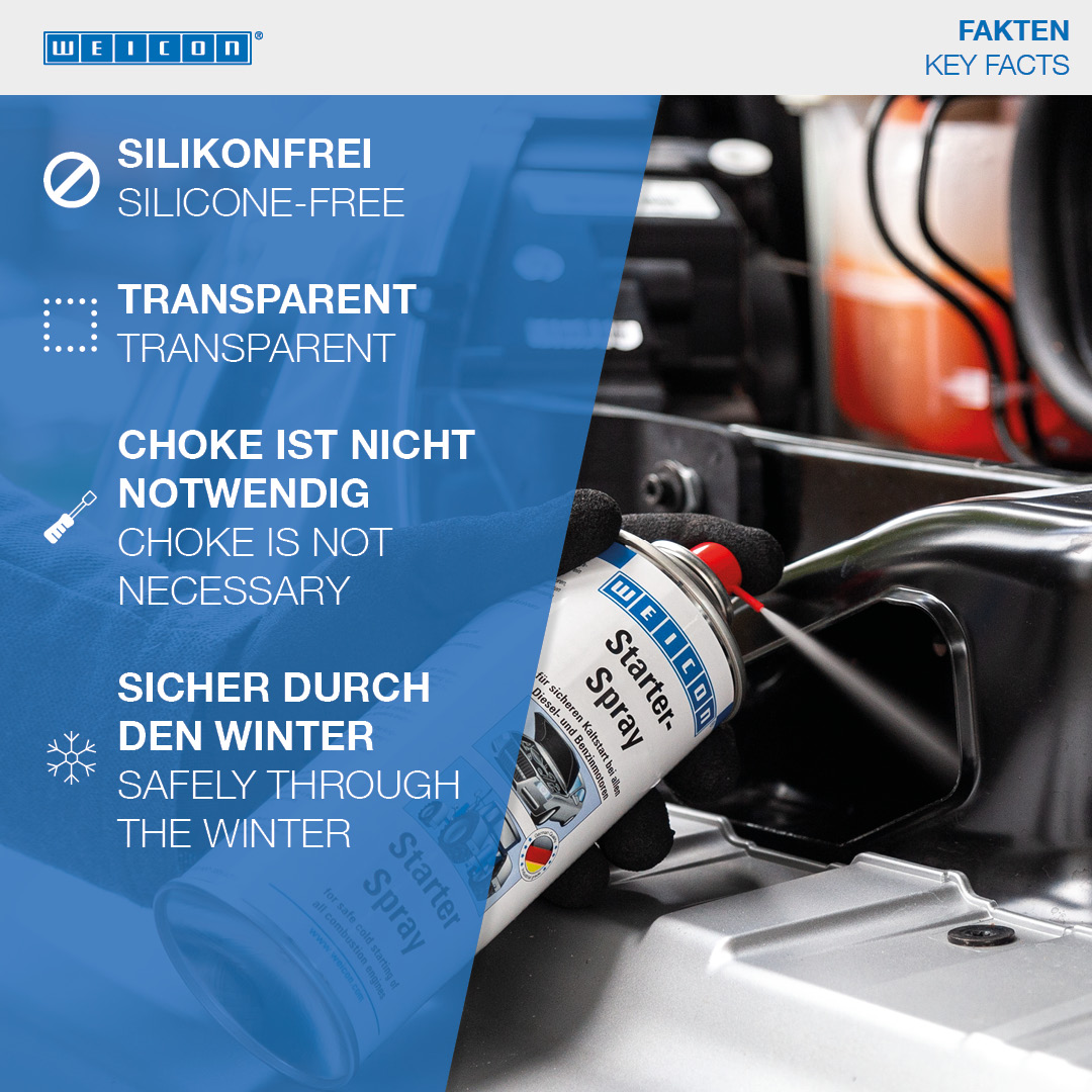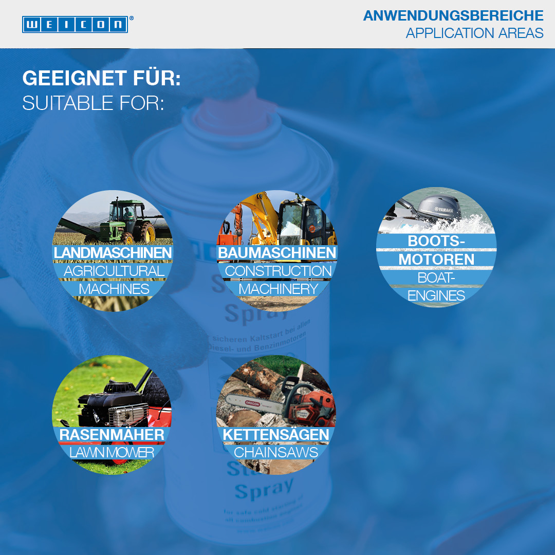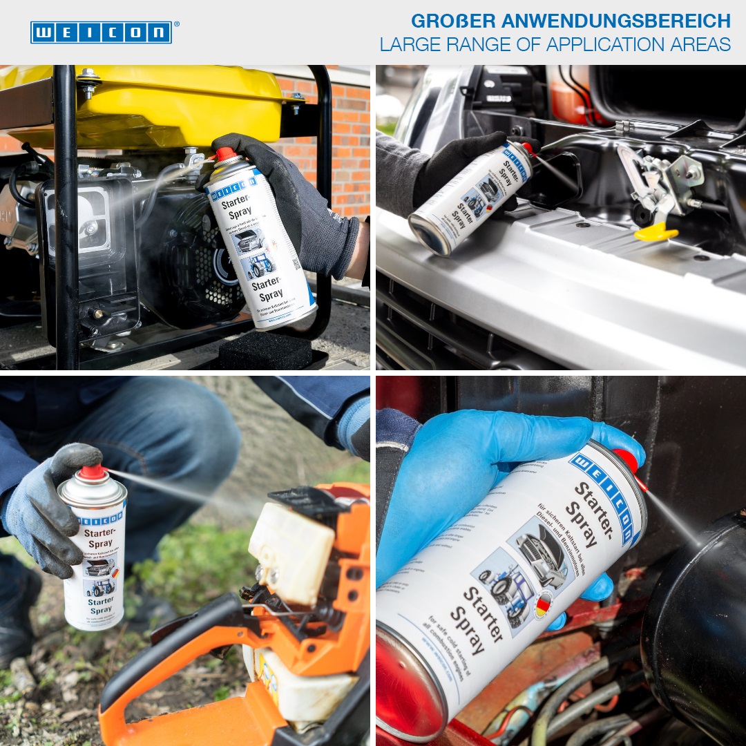 WEICON Starter Spray cocok untuk menghidupkan mesin pembakaran yang mudah dan aman. Penyalaan dingin yang aman untuk semua mesin dimungkinkan oleh kombinasi bahan khusus. Starter Spray sangat ideal digunakan pada suhu rendah, dalam cuaca lembab atau setelah mesin mati lebih lama. Dengan begitu, produk ini melindungi mesin dan aki. WEICON Starter Spray cocok untuk mesin diesel dan bensin. Dengan atau tanpa catalytic converter, baik kendaraan bermotor, mesin konstruksi, mesin pertanian, gergaji mesin, mesin pemotong rumput, mesin perahu, sepeda motor atau skuter.