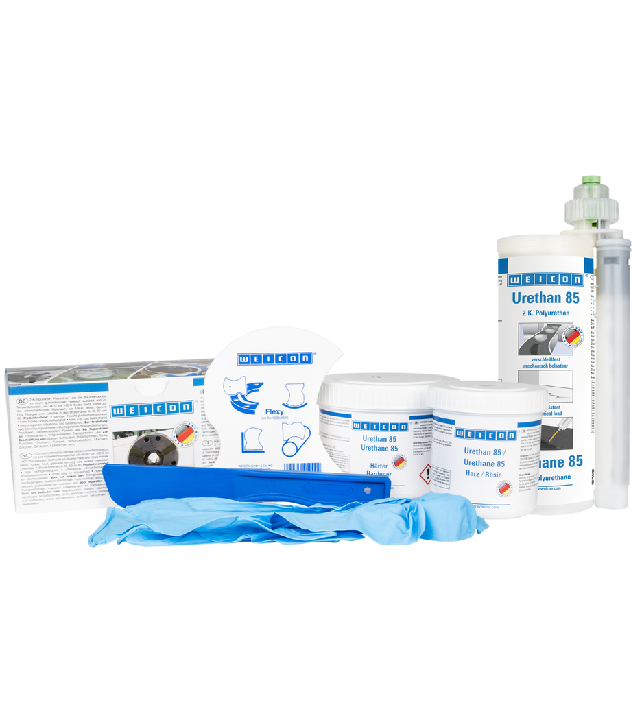 WEICON Uretane 85 adalah dempul poliuretan 2-C dengan kekuatan mekanik yang sangat baik untuk perbaikan cepat, sentuhan dan pelapisan potongan karet dan logam, yang terkena guncangan, abrasi, getaran atau gerakan. Produk ini menunjukkan elastisitas yang tinggi serta ketahanan aus yang tinggi. WEICON Urethanes 85 cocok untuk banyak aplikasi, seperti perbaikan komponen karet dan ban berjalan, perbaikan dan perbaikan lapisan karet, sebagai perlindungan keausan yang fleksibel untuk rumah pompa dan impeler, serta untuk perbaikan cepat seal dan rol karet yang aus.