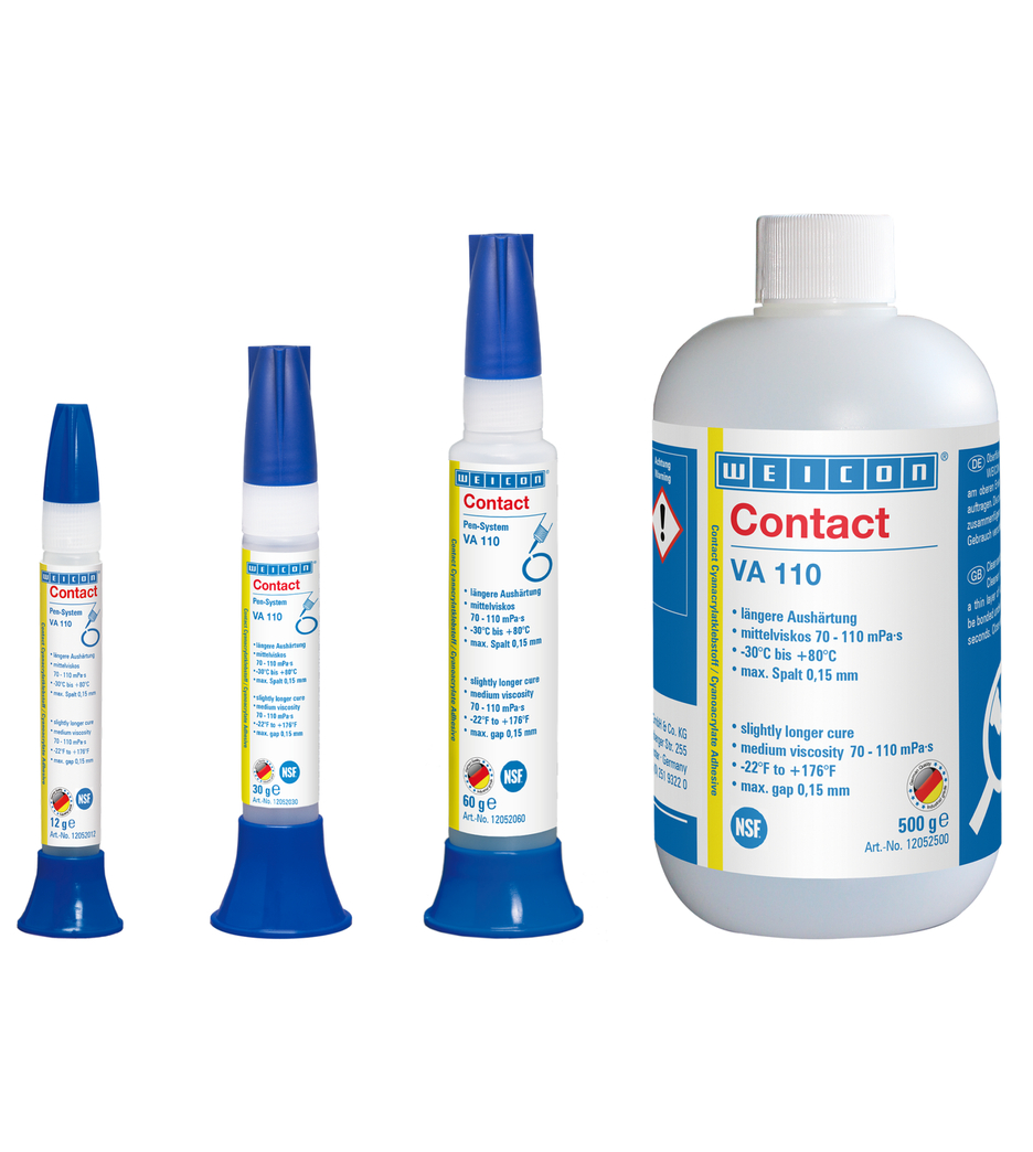 WEICON VA 110 adalah perekat cyanoacrylate dengan registrasi NSF, yang dapat digunakan di area sensitif seperti di industri farmasi, dalam pembuatan kosmetik, industri makanan atau dalam pembuatan mainan untuk mengikat karet dan plastik.