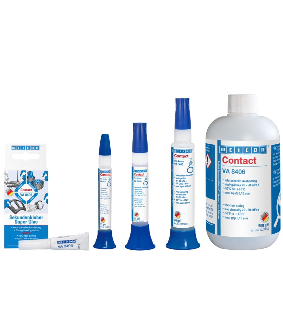 WEICON Contact VA 8406 cocok untuk pengikatan dan pengikatan cepat berbagai bahan karet, seperti karet padat atau karet seluler, plastik, dan elastomer EPDM. Dalam kombinasi dengan WEICON CA-Primer, VA 8406 juga dapat digunakan untuk poliolefin (PE-polietilena, PP-polipropilena) dan untuk PTFE dan silikon.