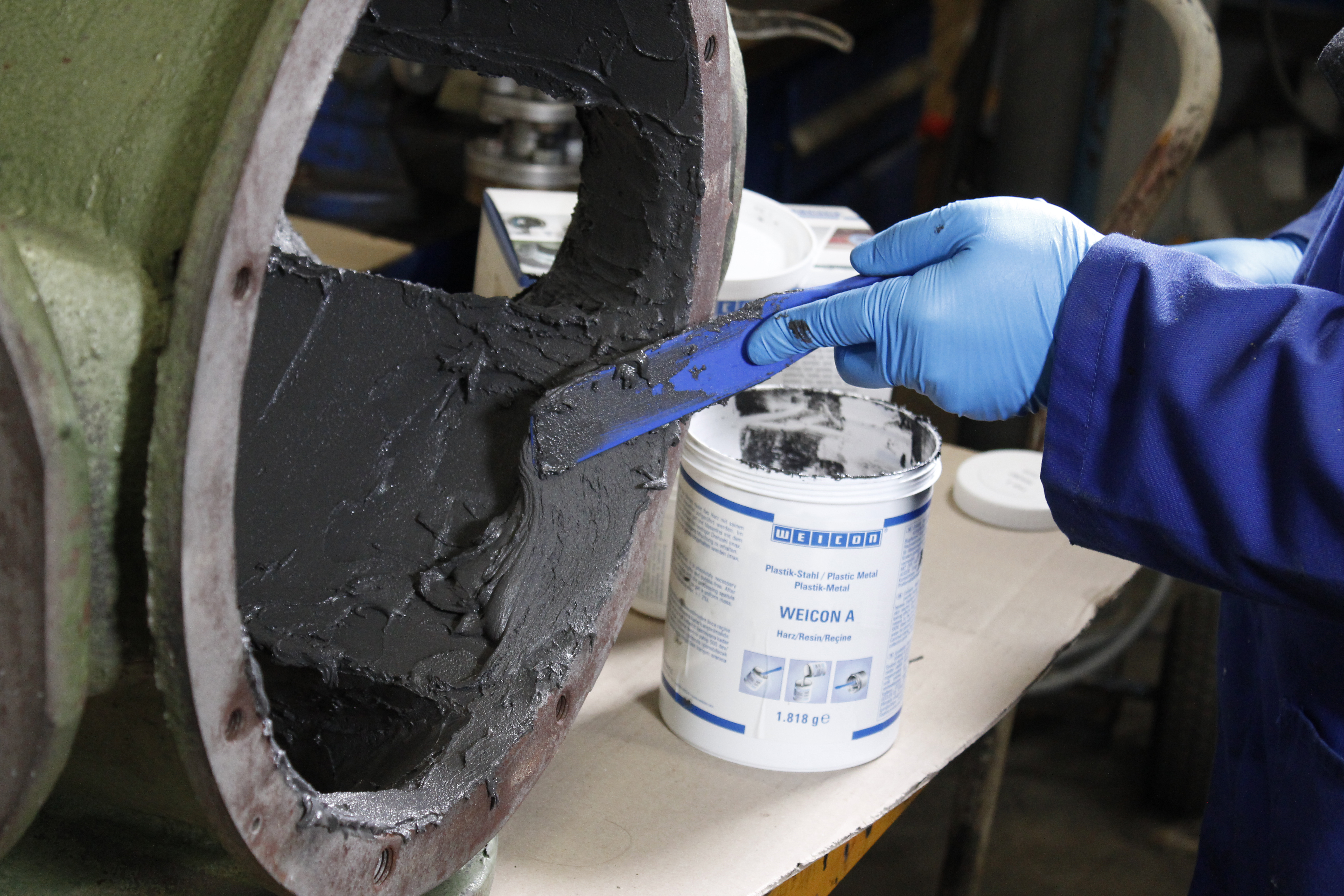 WEICON A memiliki sertifikat DNV dan sangat cocok untuk pekerjaan perbaikan dan pemeliharaan di industri maritim. Sistem resin epoksi sangat penuh dengan pigmen baja, bersifat magnetis dan teksturnya yang seperti pasta memungkinkan aplikasi bahkan pada permukaan vertikal. Ini dapat digunakan untuk menghilangkan kerusakan korosi dan lubang atau untuk memperbaiki lubang dan lubang sembur. Sebagai contoh, dapat digunakan untuk mereproduksi komponen baja berat yang menunjukkan kerusakan parah akibat korosi dan lubang. Dalam hal ini, WEICON A memberikan alternatif nyata untuk pengelasan, karena aplikasi resin epoksi tidak menyebabkan distorsi termal seperti pada pengelasan. Sistem 2 komponen ini dapat digunakan untuk perbaikan pada tangki dan pipa serta untuk memperbaiki keretakan pada rumah mesin atau pompa dan bagian-bagian mesin. Ini sangat ideal untuk digunakan dalam sistem saluran pembuangan di mana pipa dan saluran pipa terkena pengaruh media yang kuat. Aplikasi lain termasuk pembuatan model, cetakan, alat dan perangkat penjepit. WEICON A dapat digunakan dalam teknik mesin, pembuatan perkakas, industri semen, pembangkit listrik, pembuatan model dan cetakan, dan di banyak sektor industri lainnya.